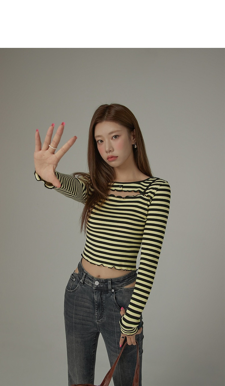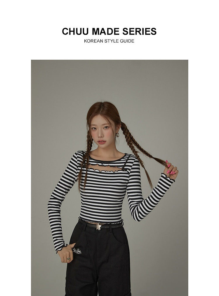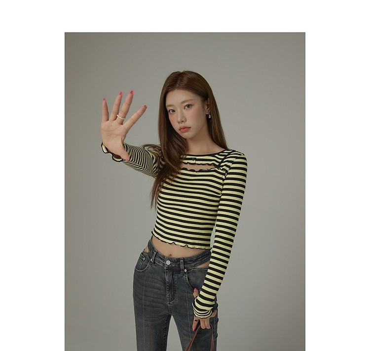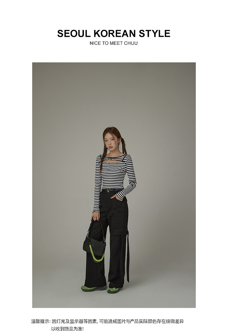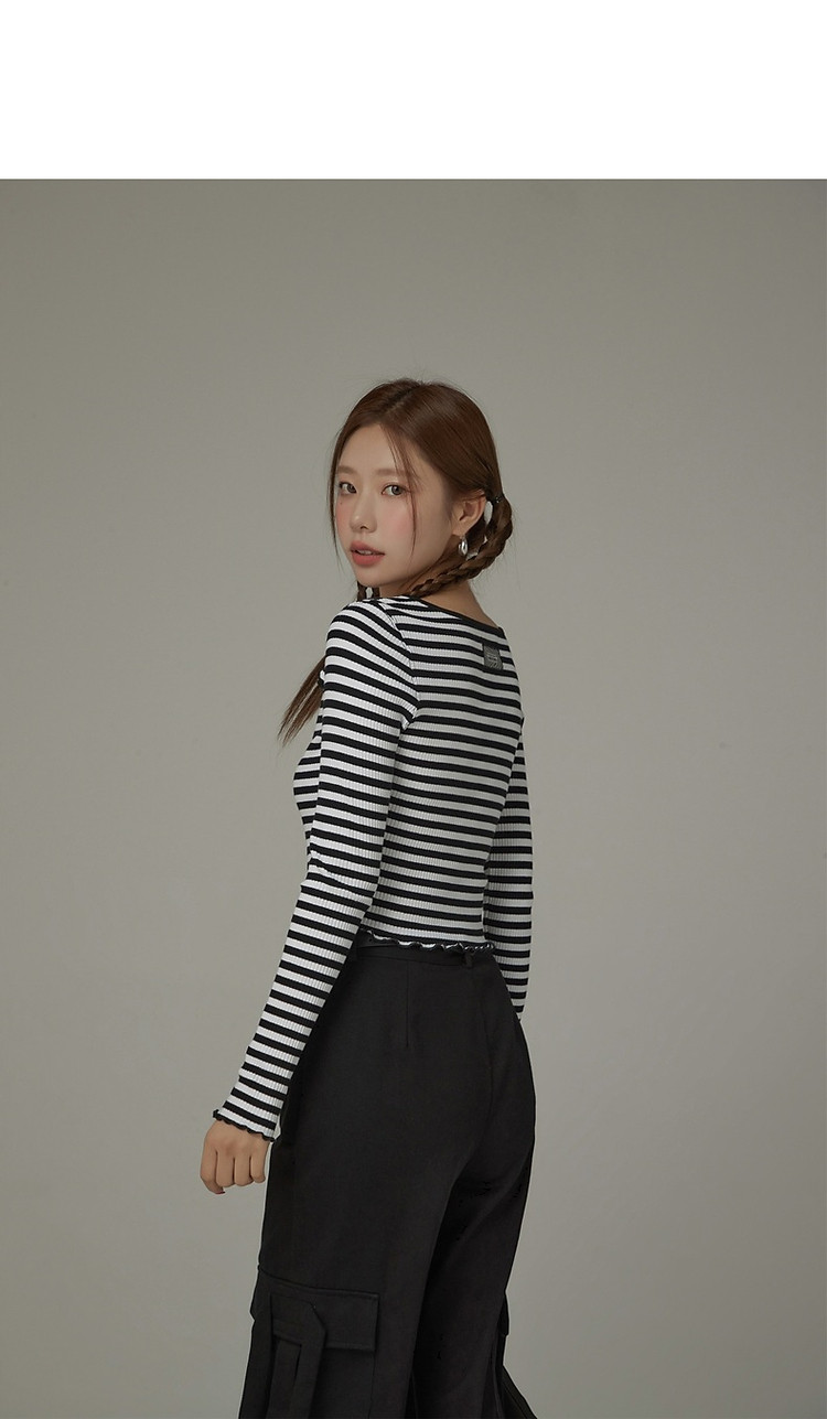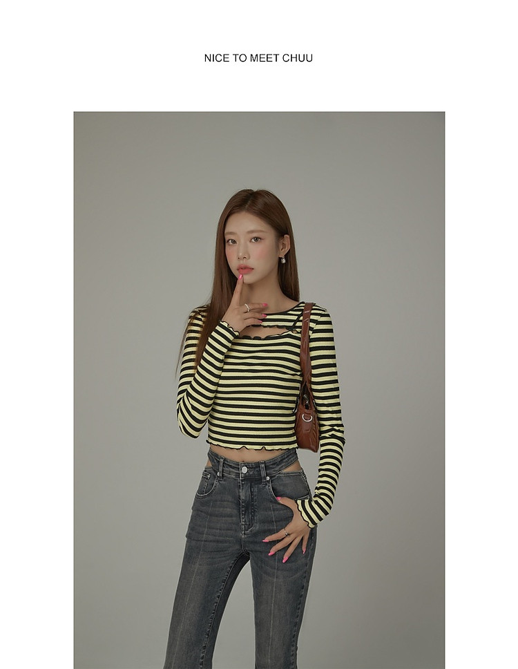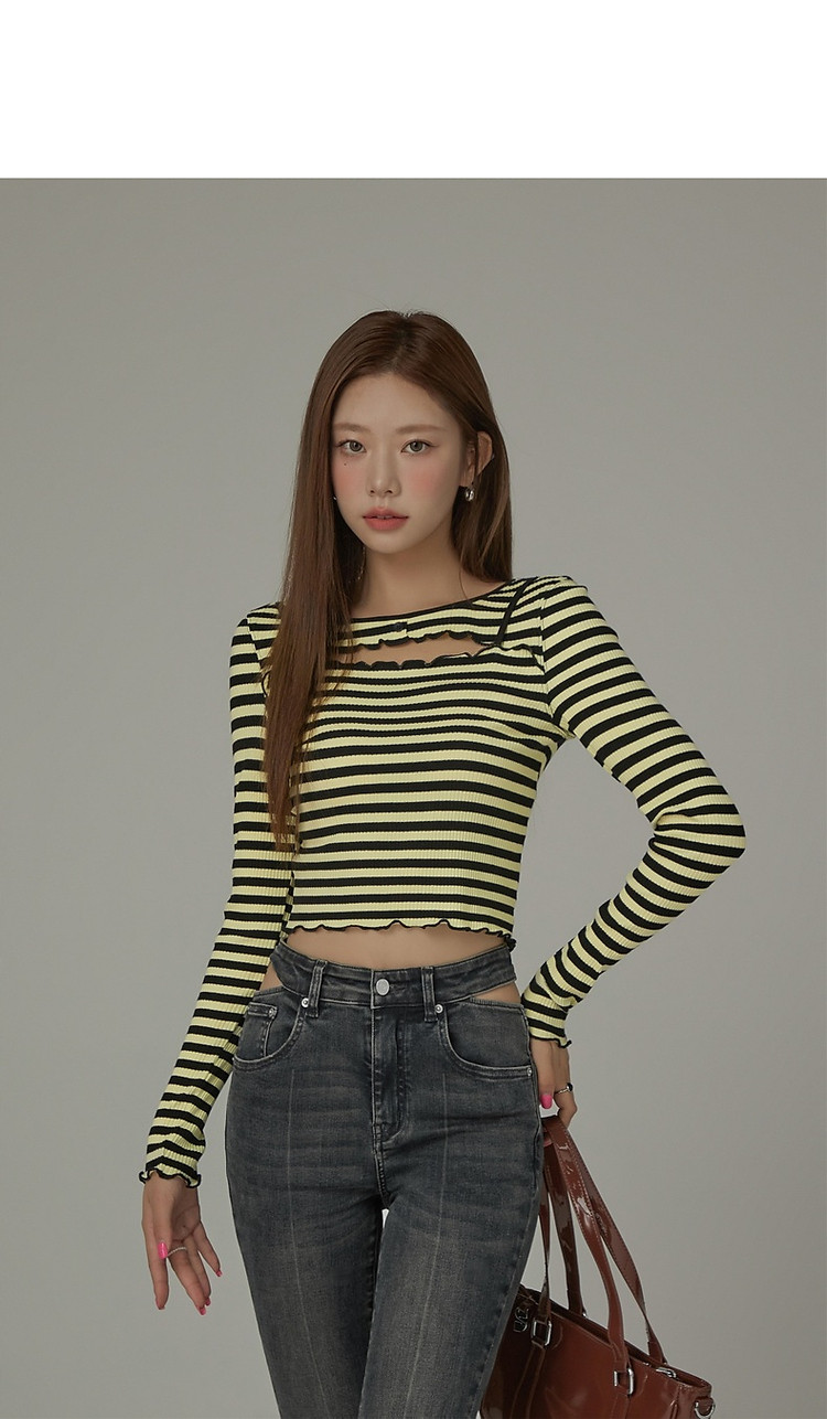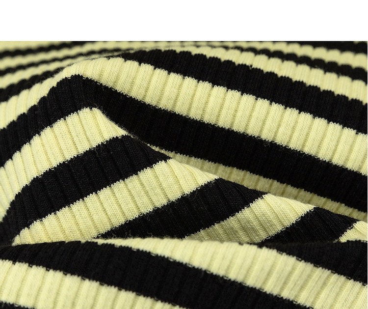 商品名称:条纹镂空T恤女春撞色木耳边长袖时尚短上衣 098259