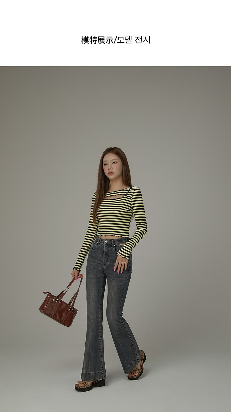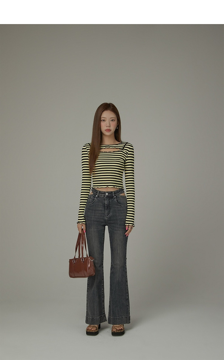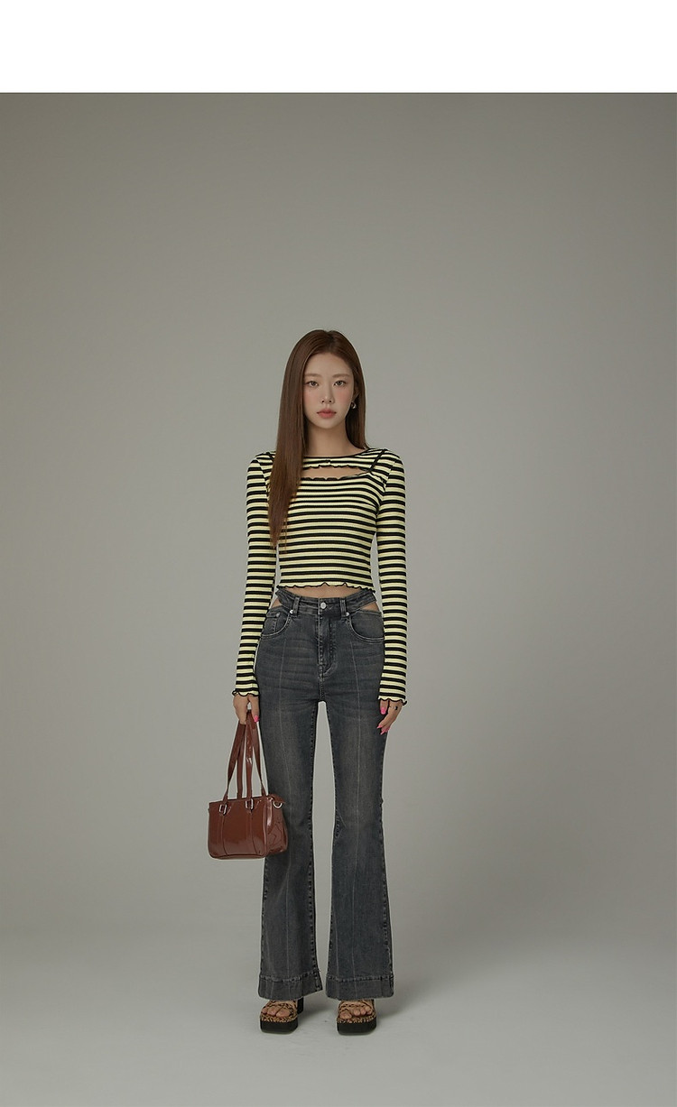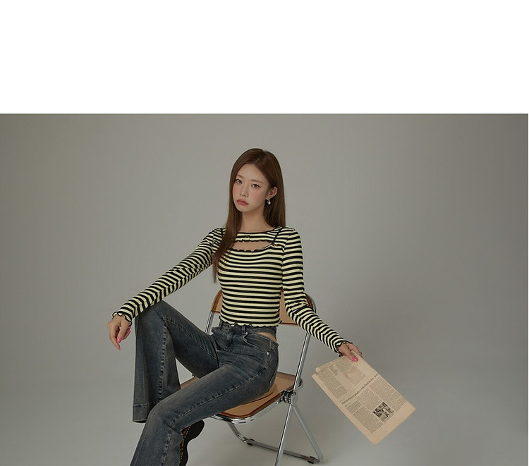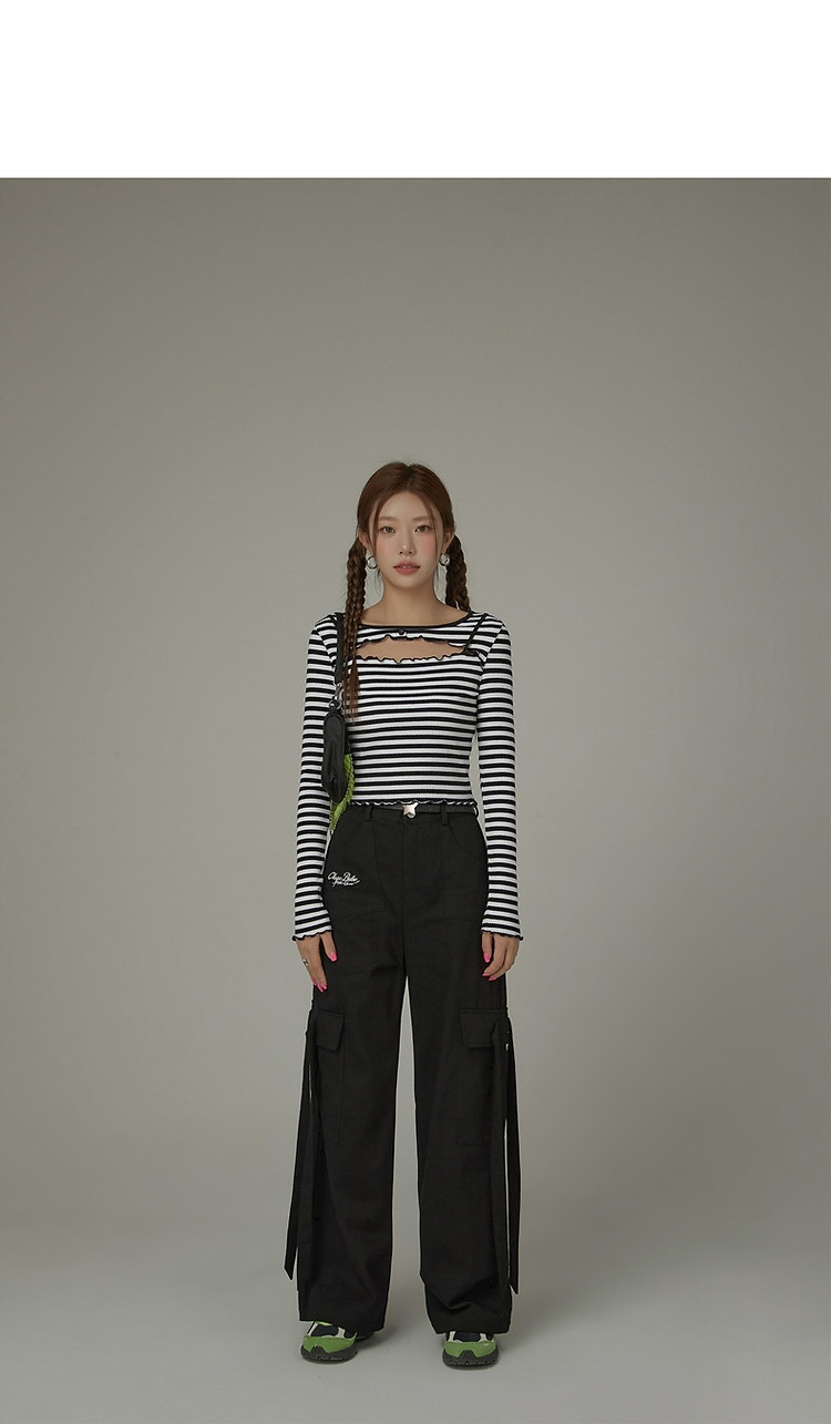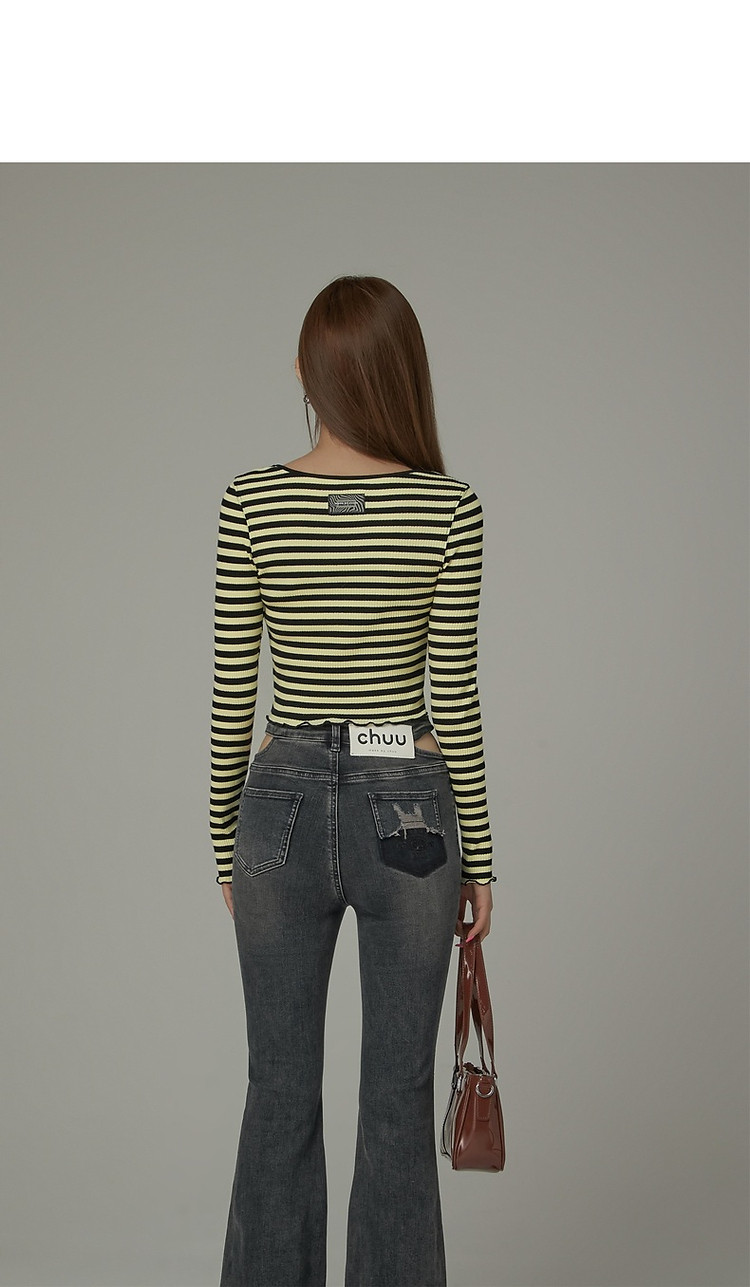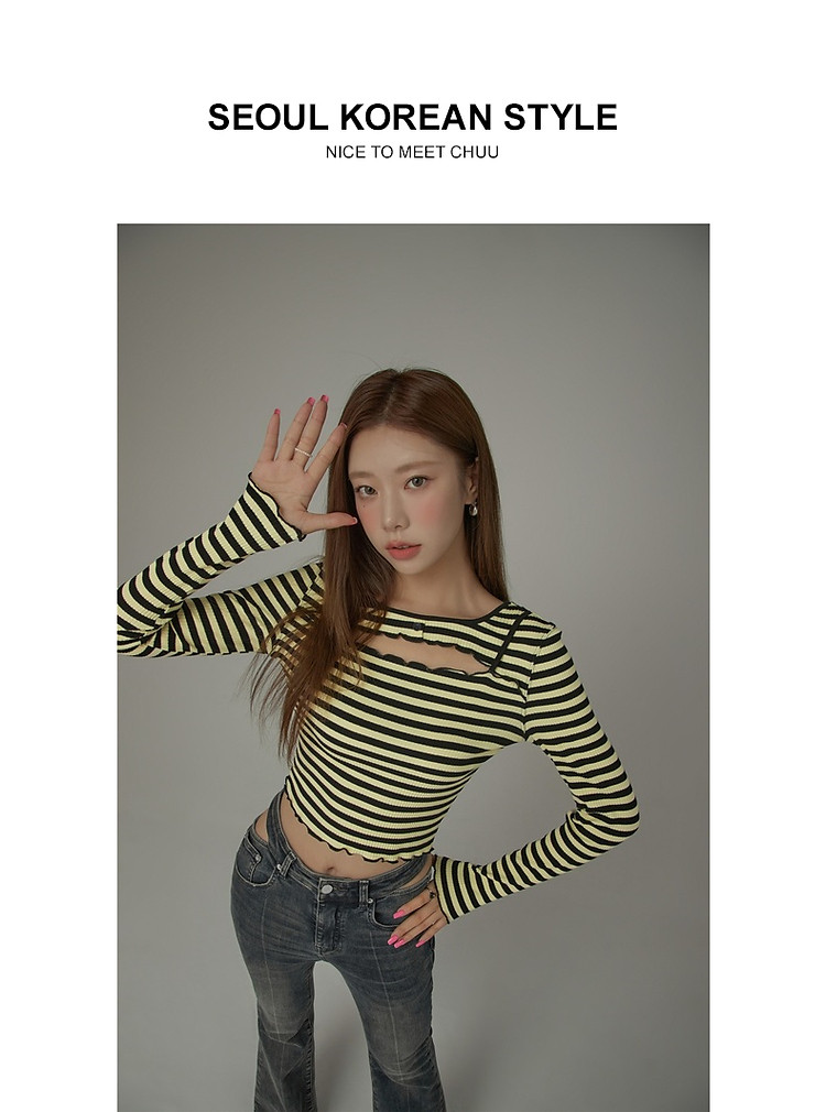 商品名称:条纹镂空T恤女春撞色木耳边长袖时尚短上衣 098259