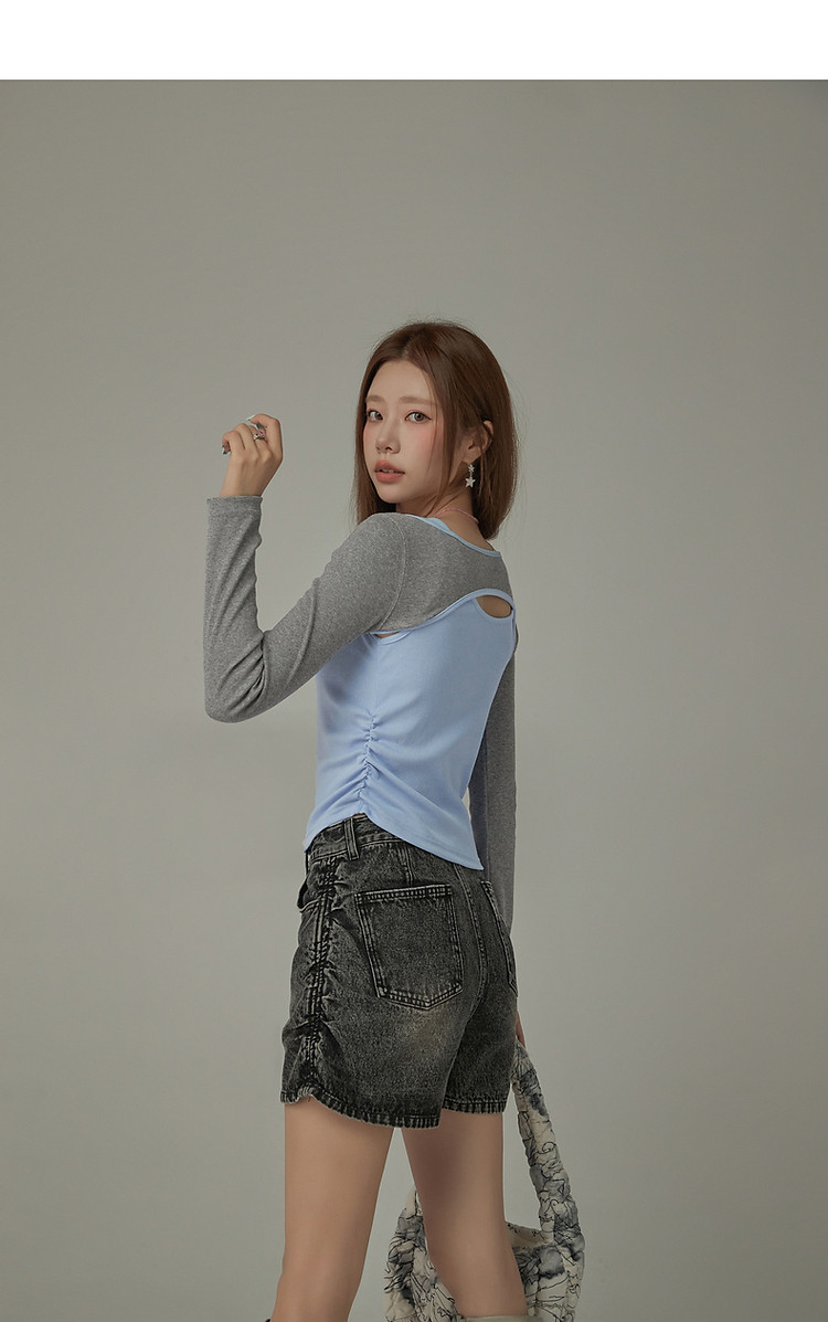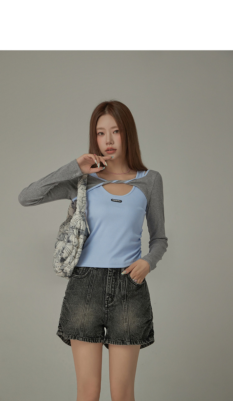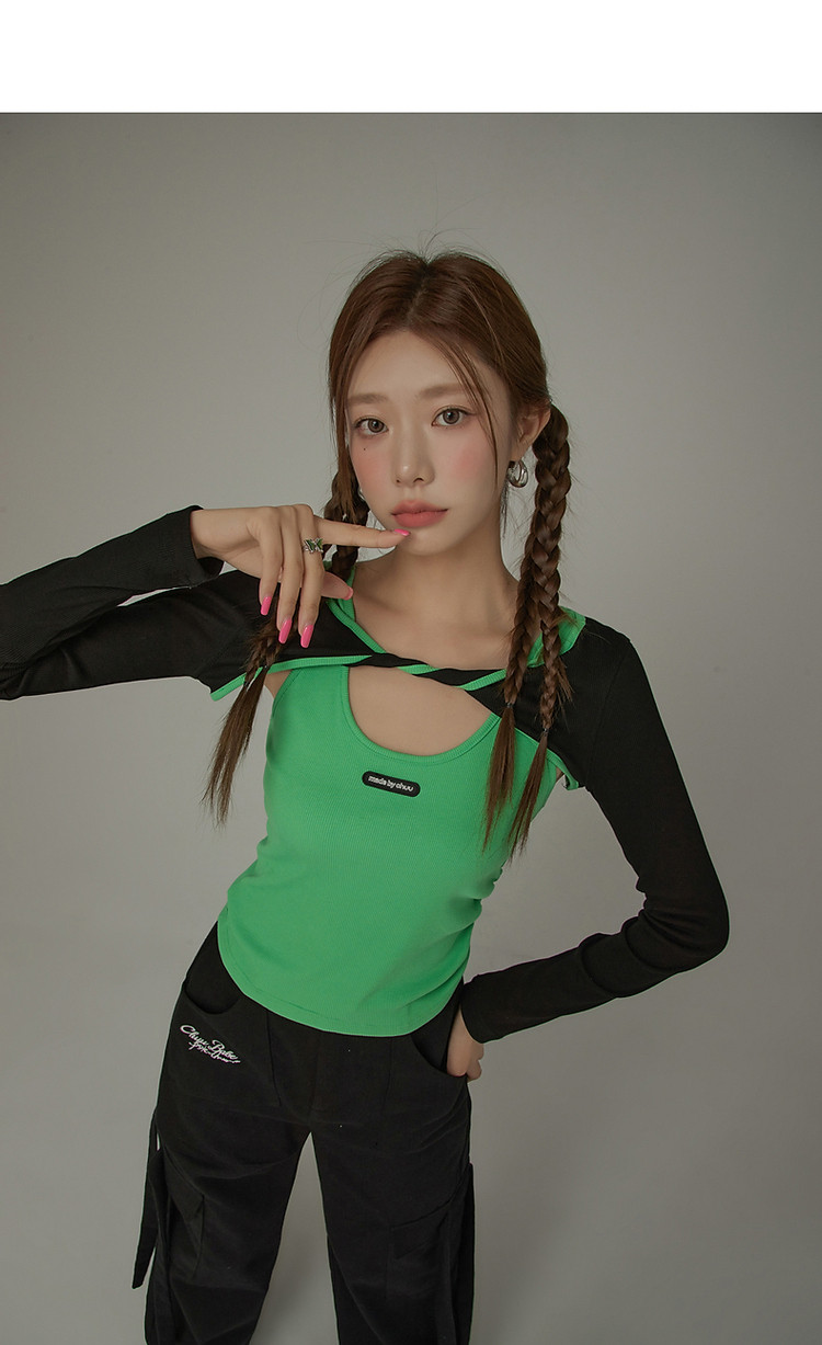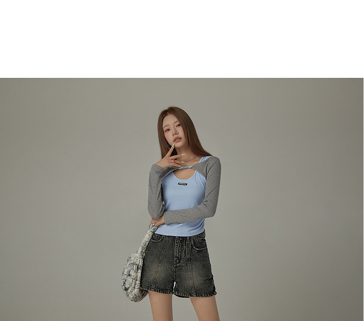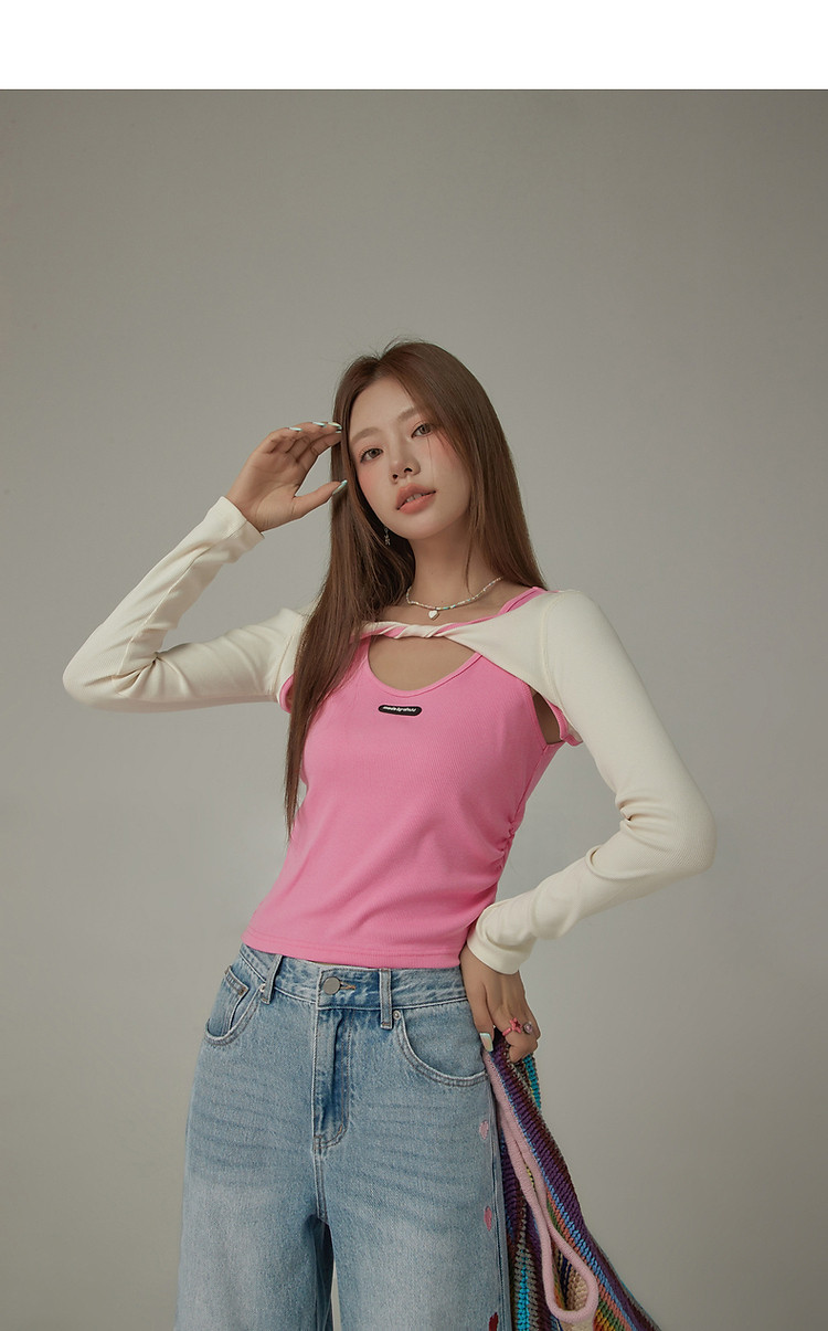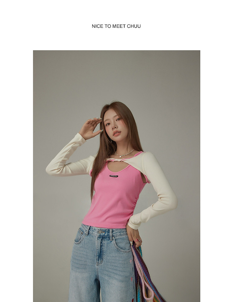 假两件长袖T恤女春秋辣妹露背拼接撞色打底短上衣 386131