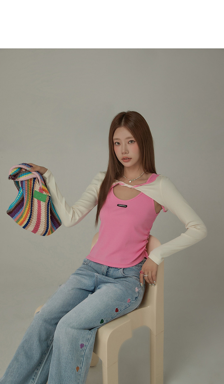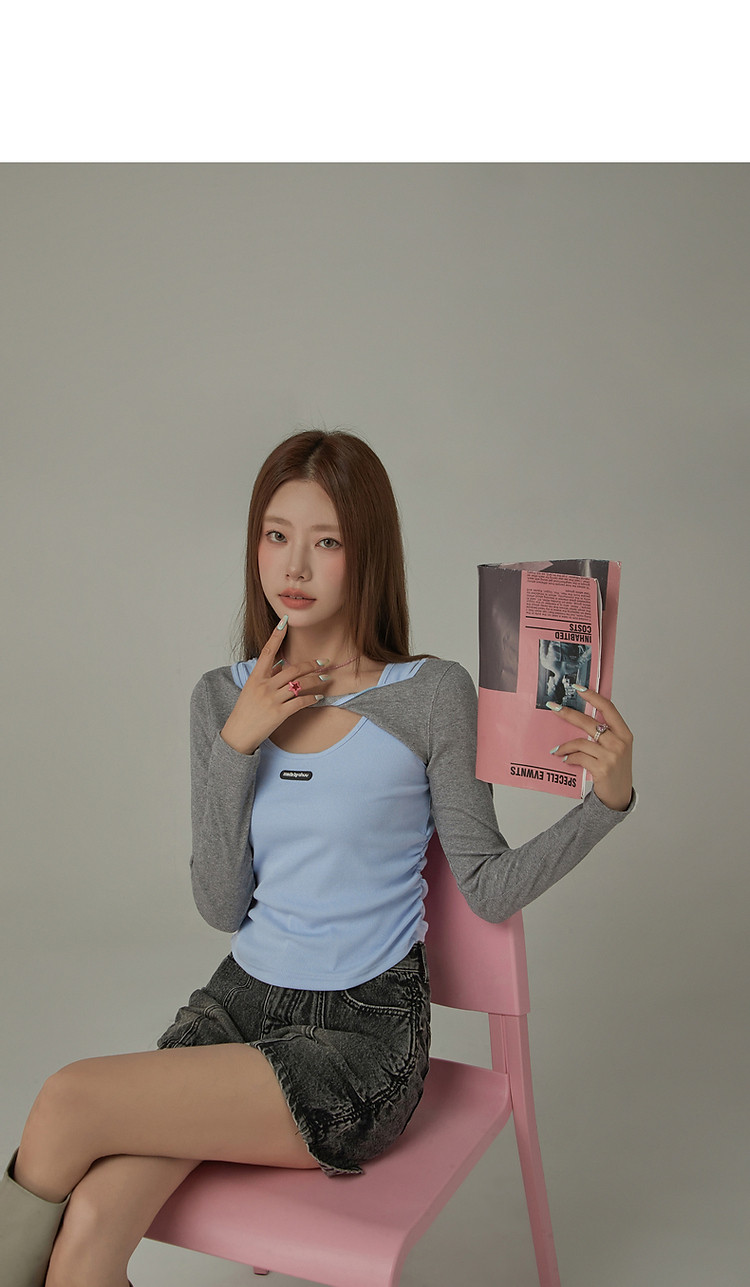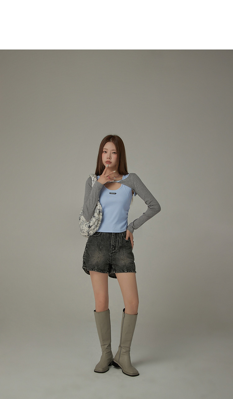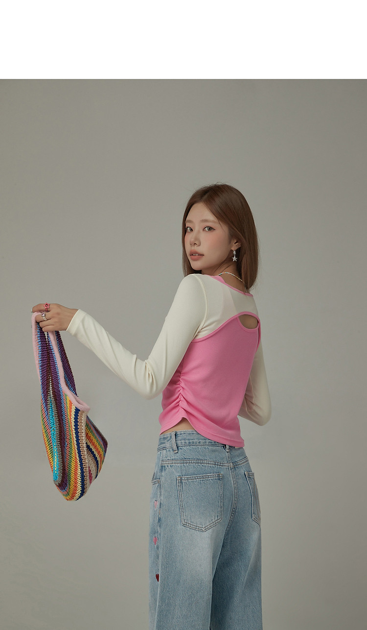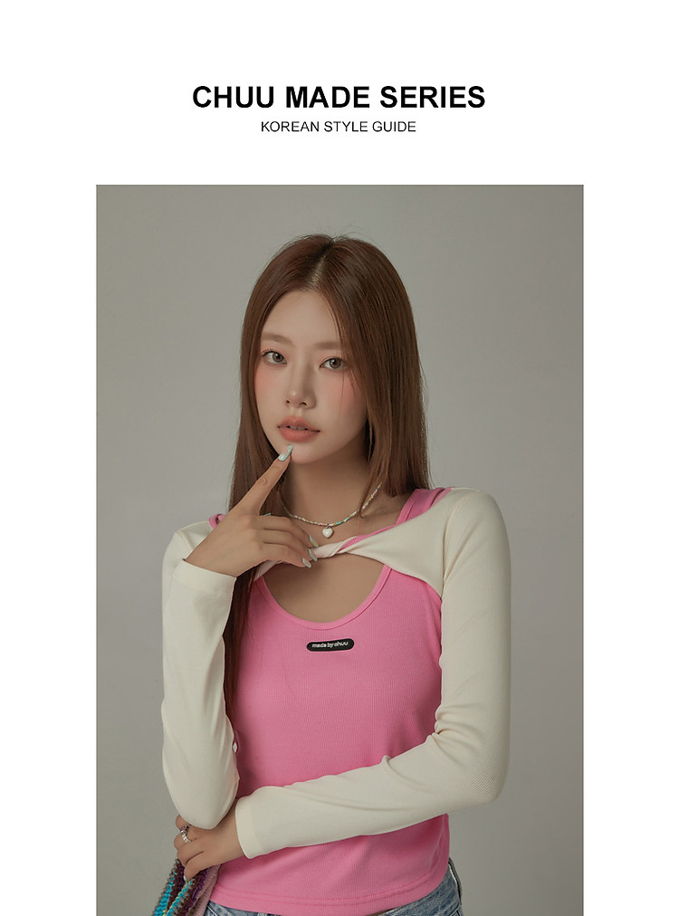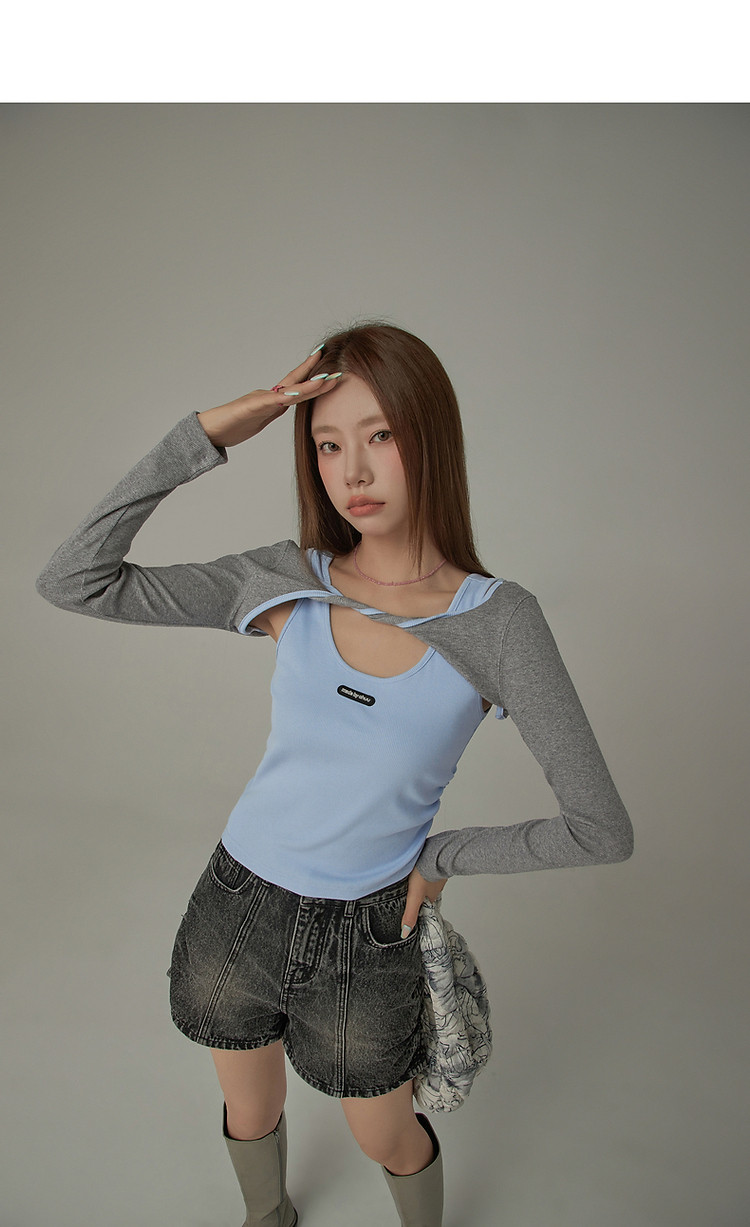 假两件长袖T恤女春秋辣妹露背拼接撞色打底短上衣 386131