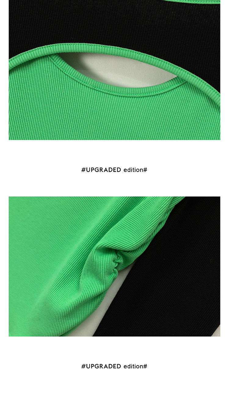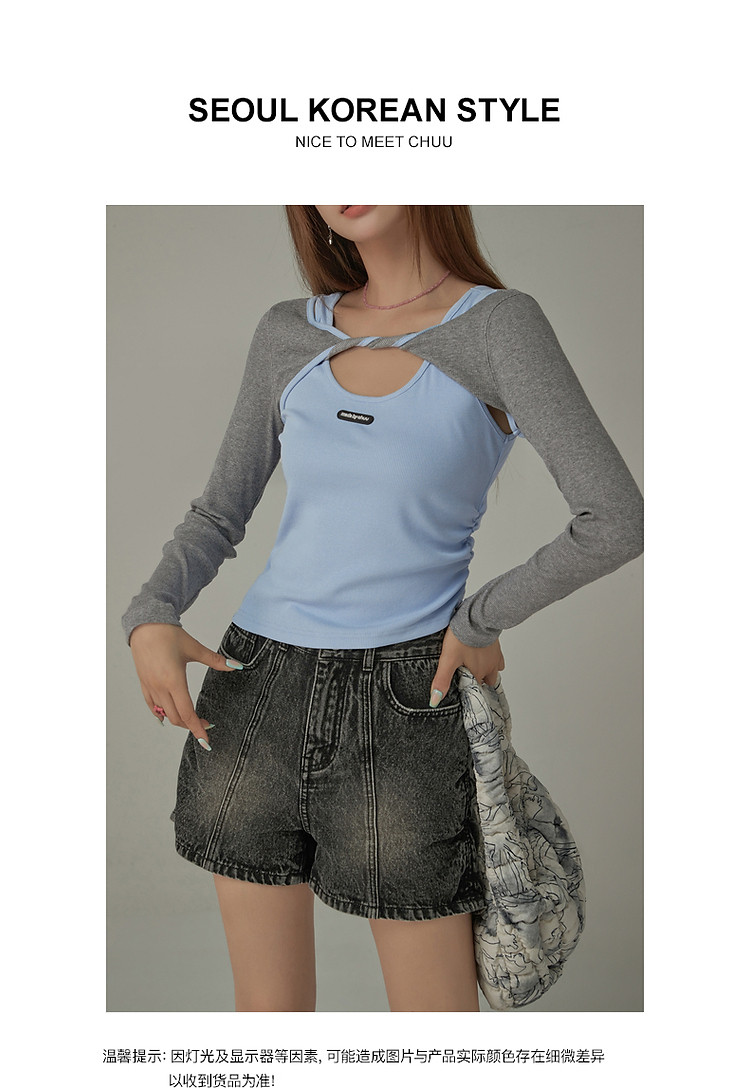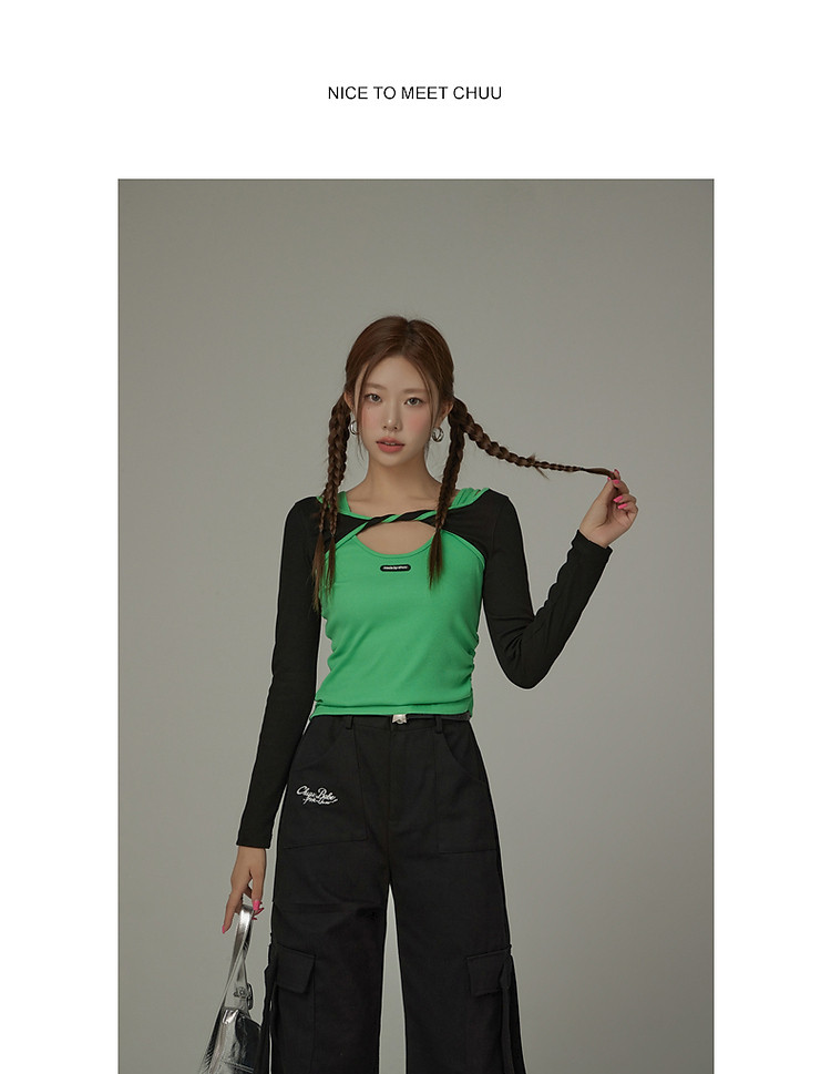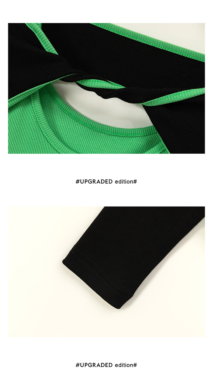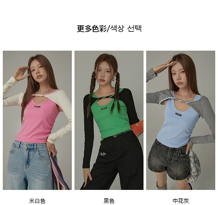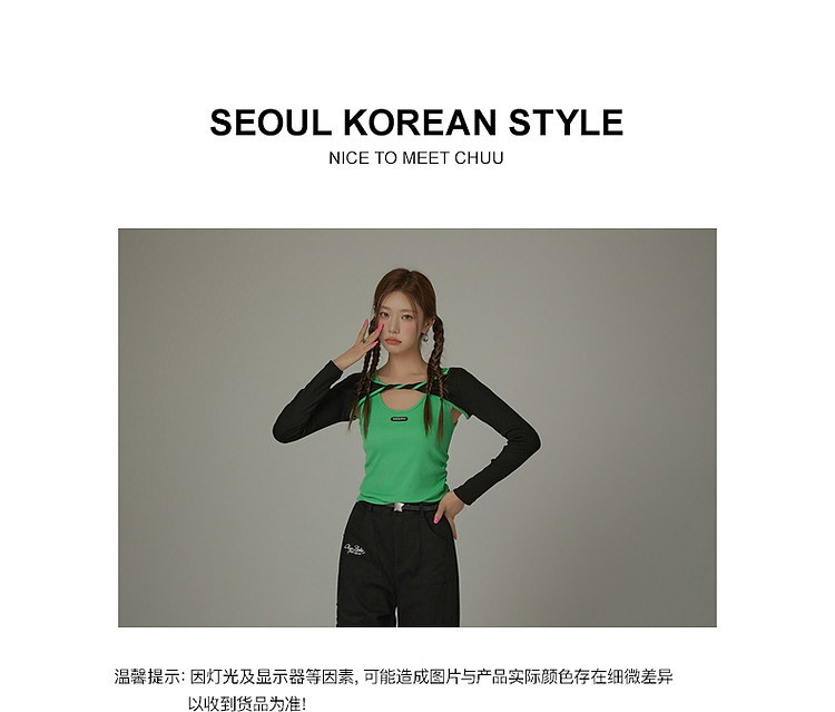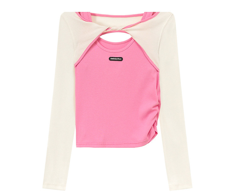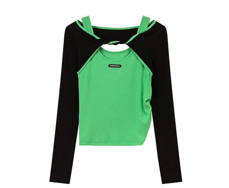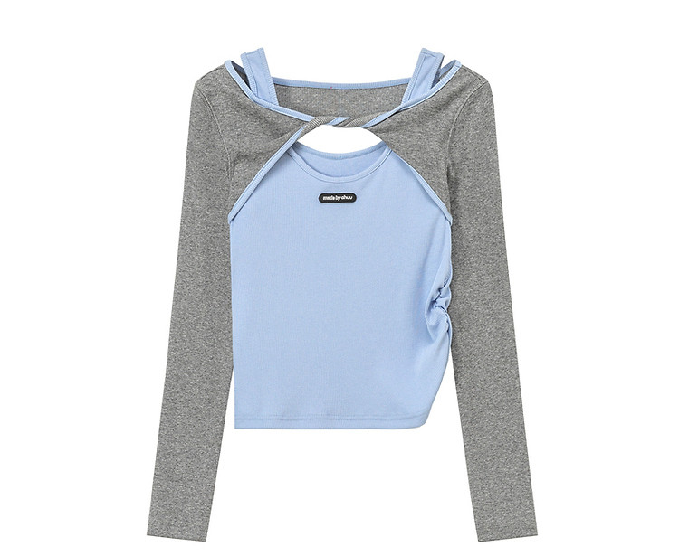 商品名称:假两件长袖T恤女春秋辣妹露背拼接撞色打底短上衣 386131
