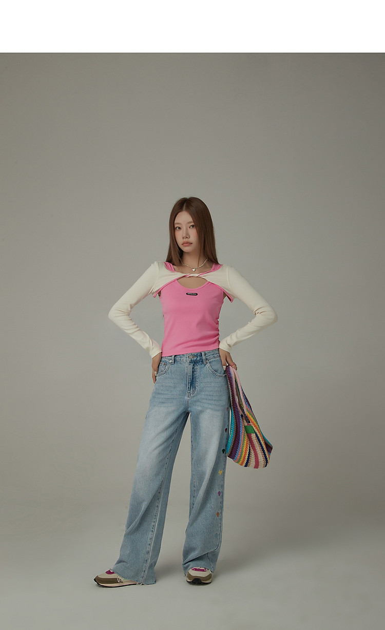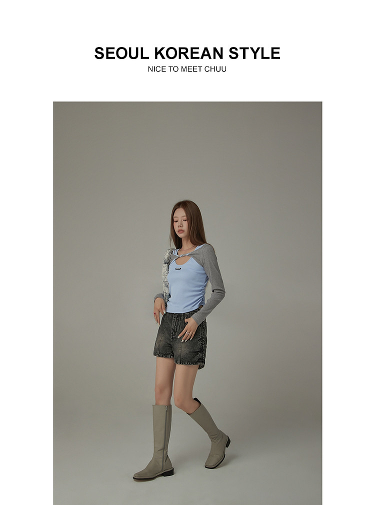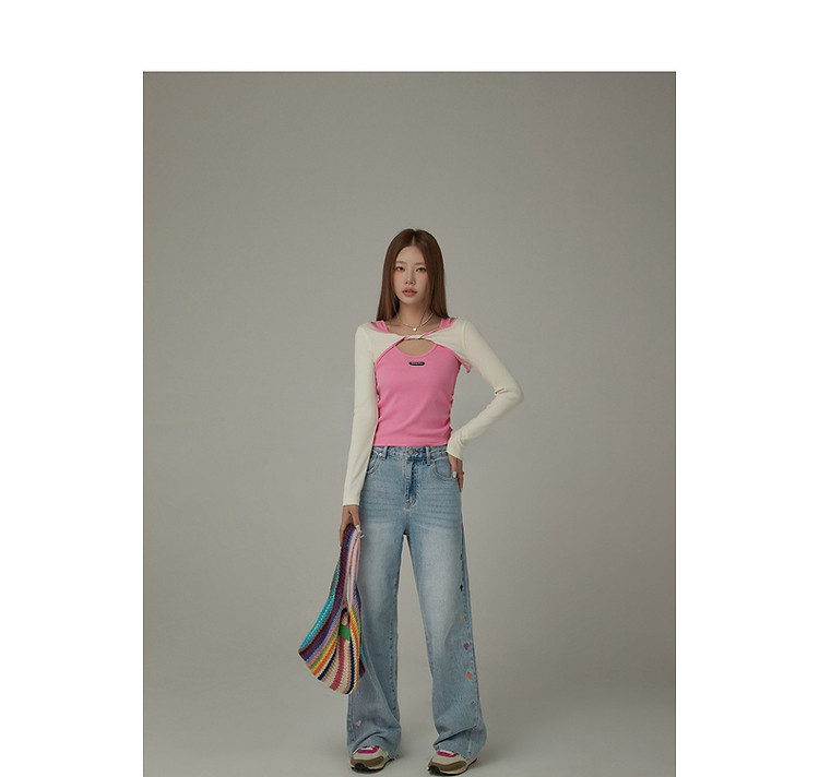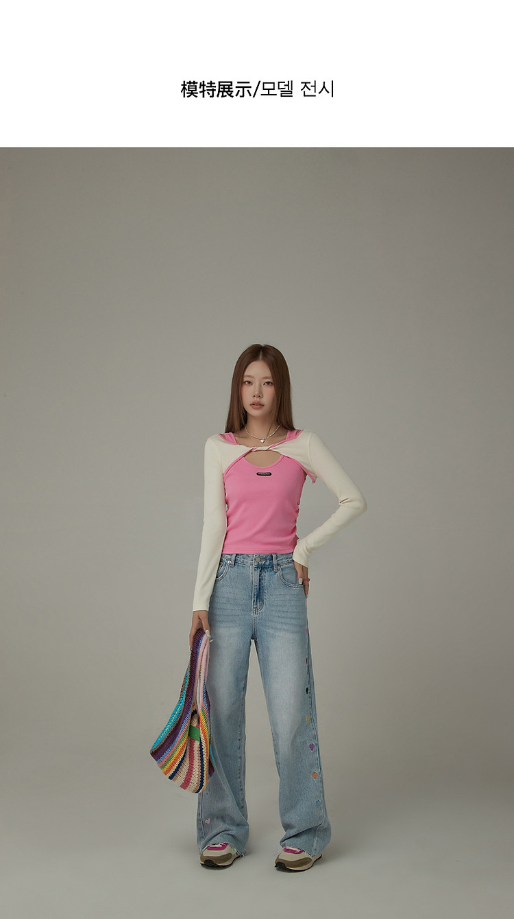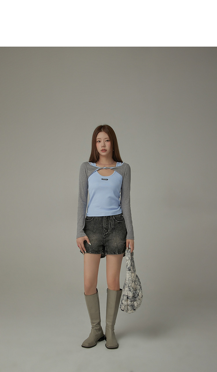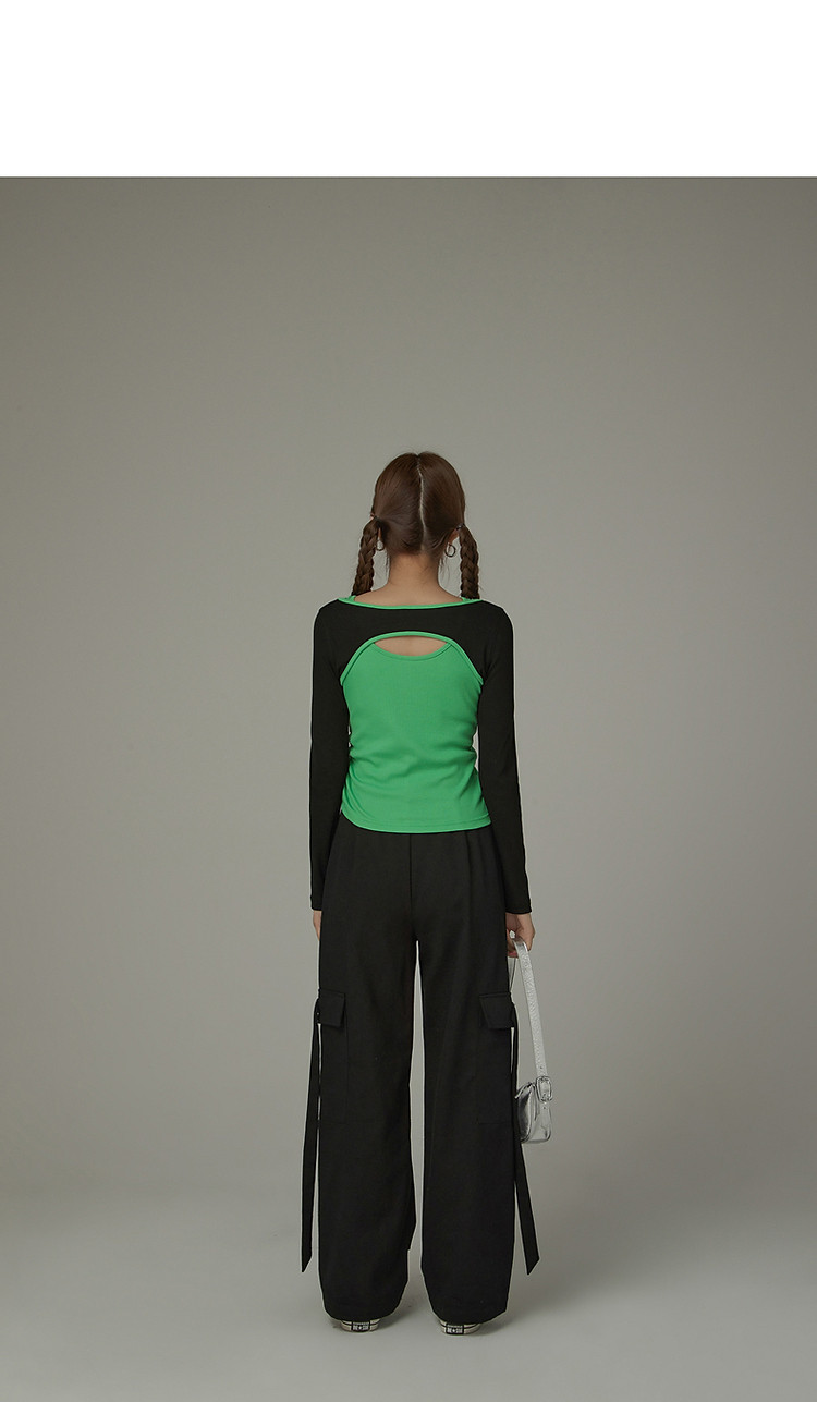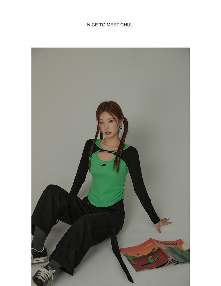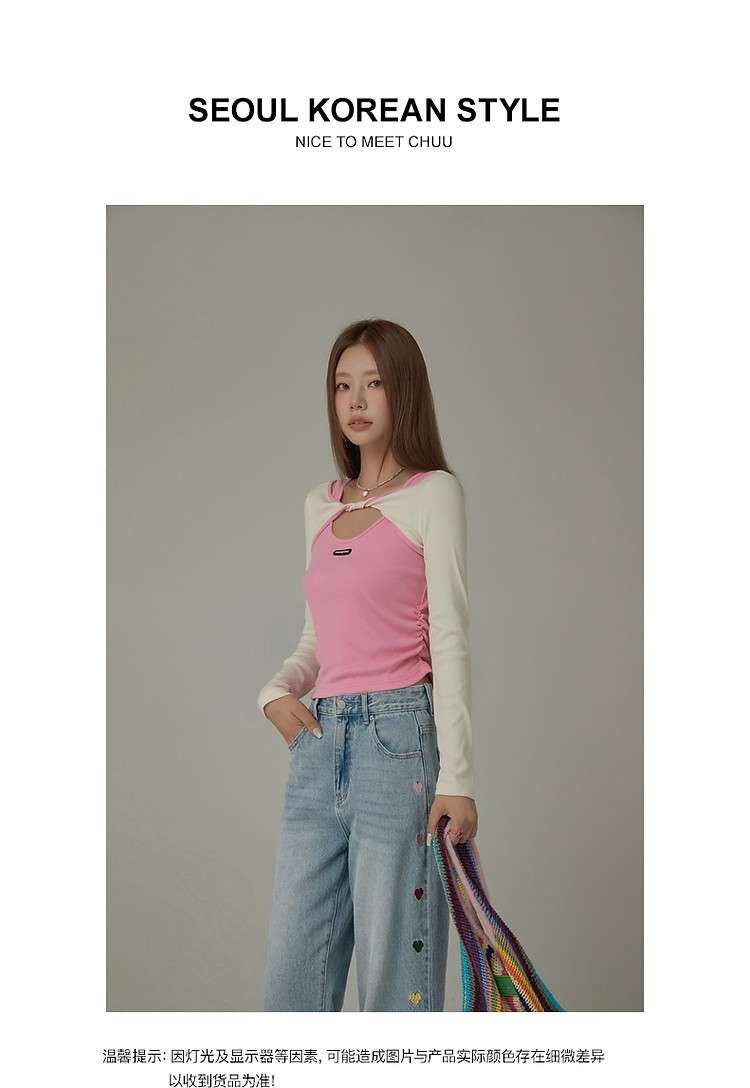 商品名称:假两件长袖T恤女春秋辣妹露背拼接撞色打底短上衣 386131