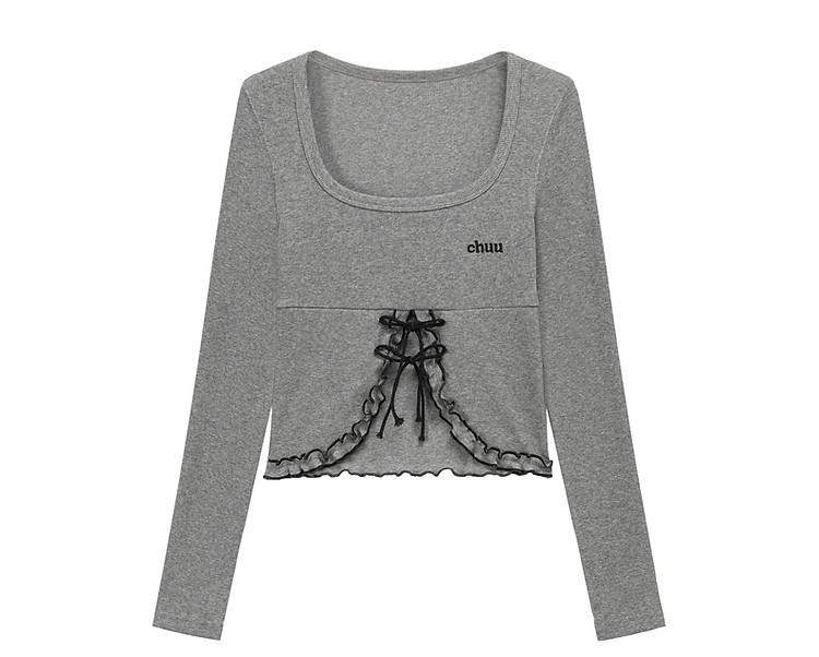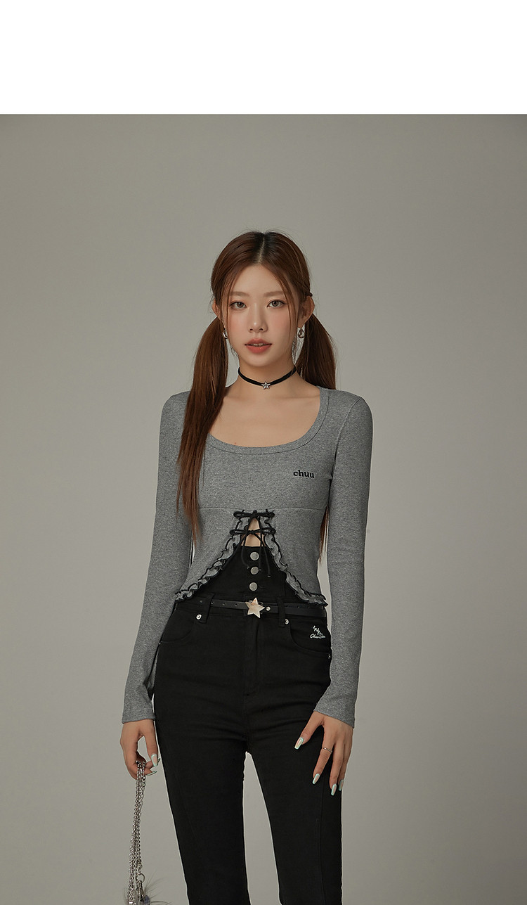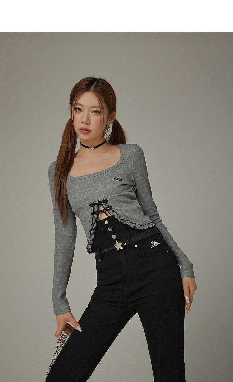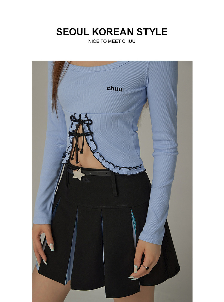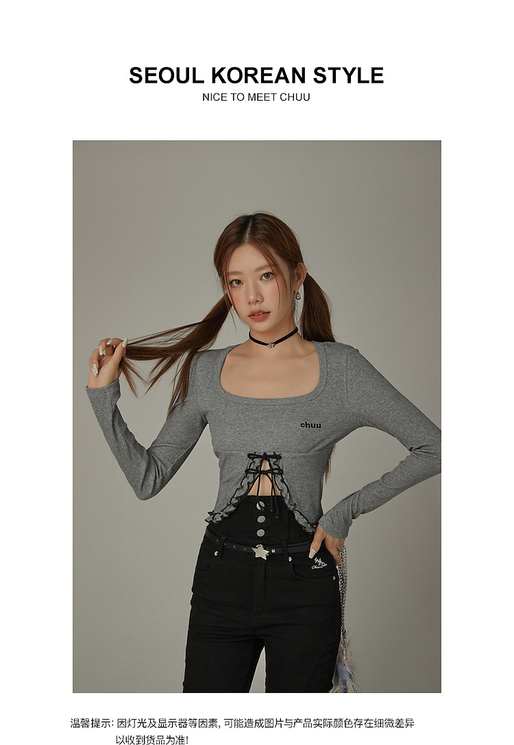 CHUU字母绣花长袖T恤女春秋木耳边露腰系带短上衣 908819