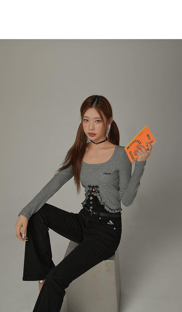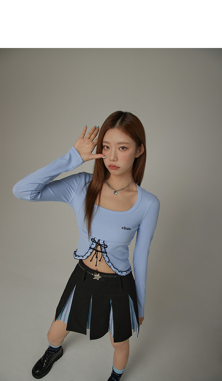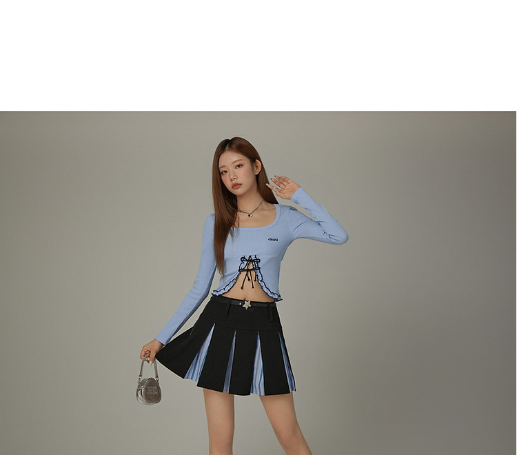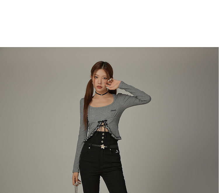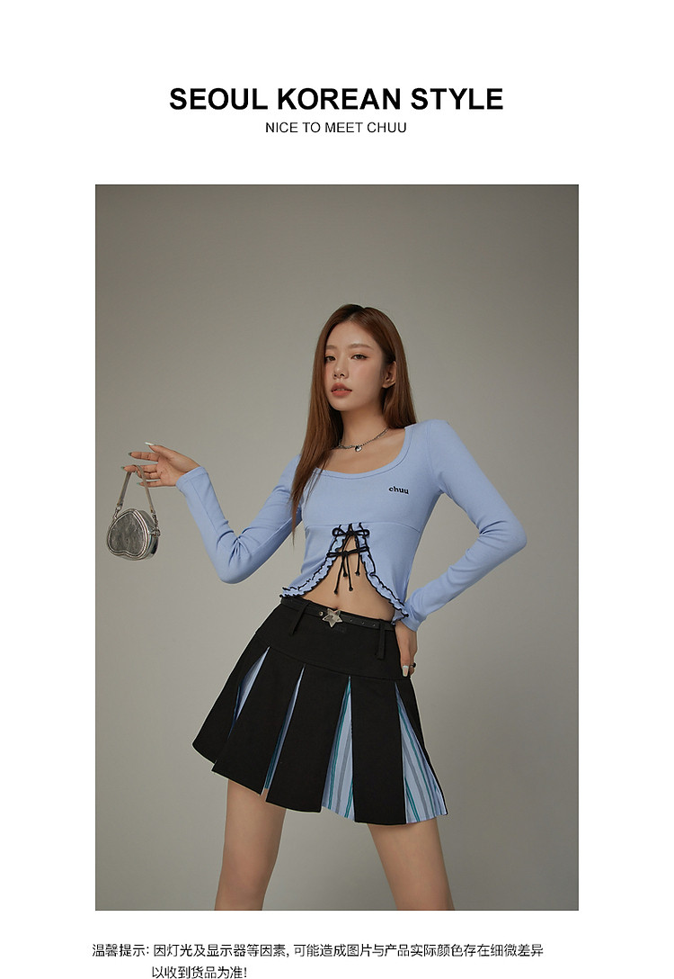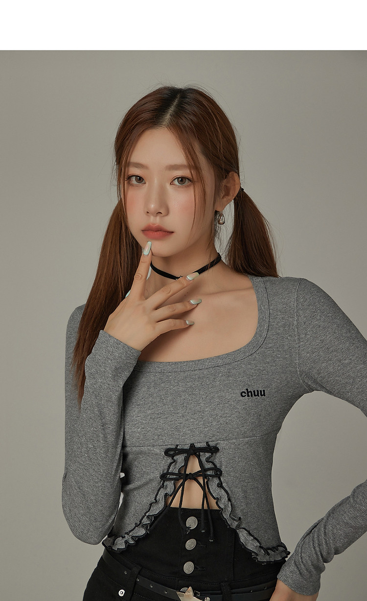 CHUU字母绣花长袖T恤女春秋木耳边露腰系带短上衣 908819