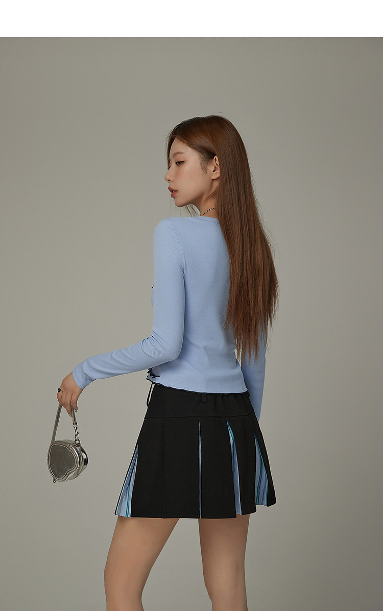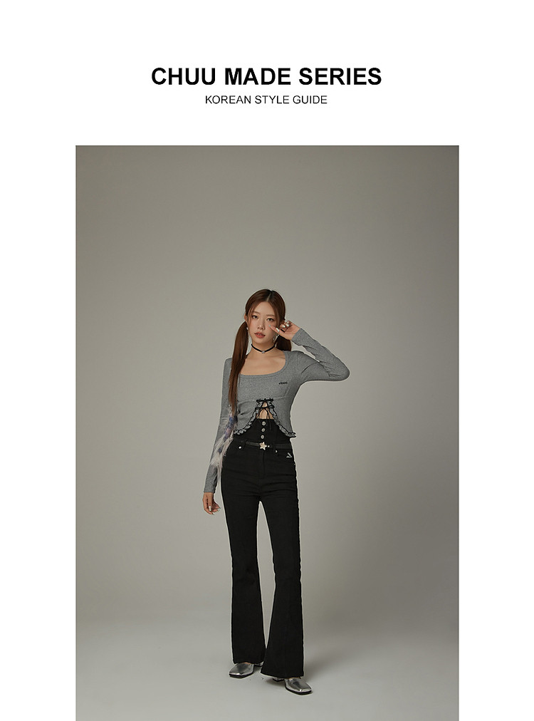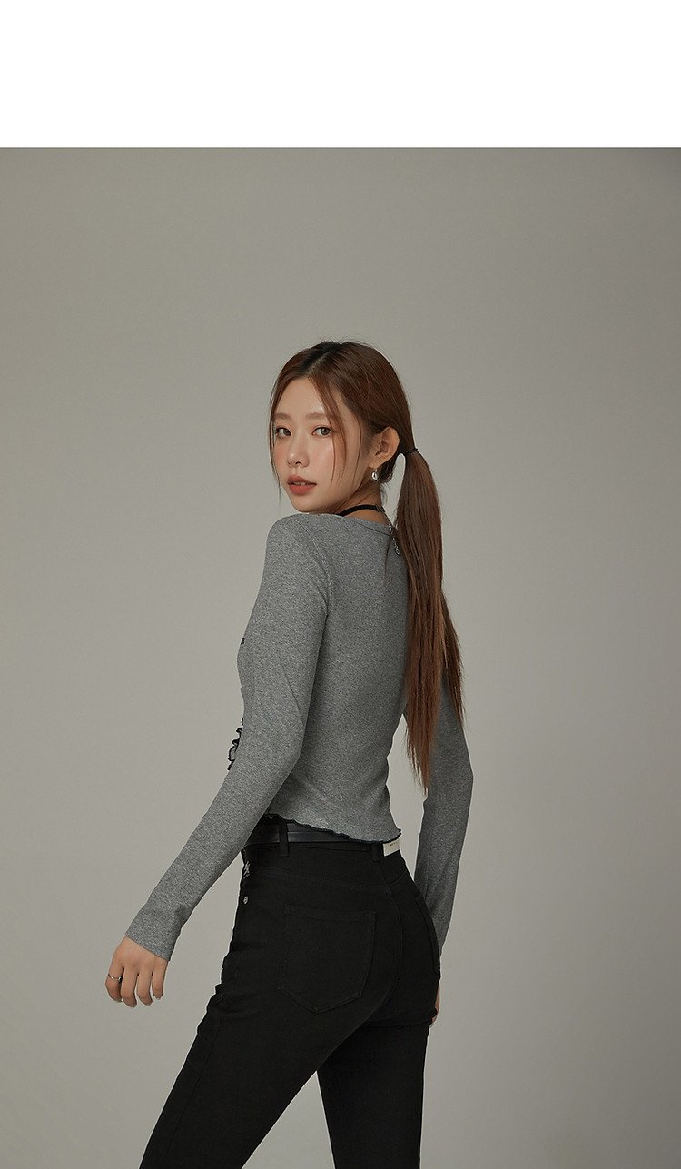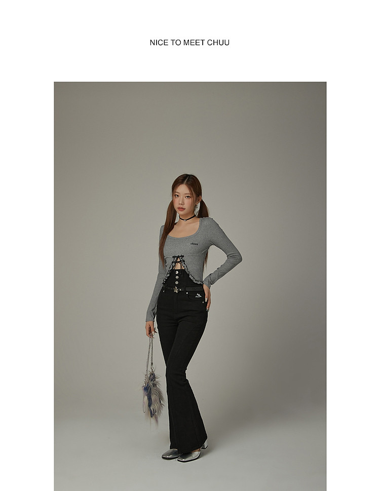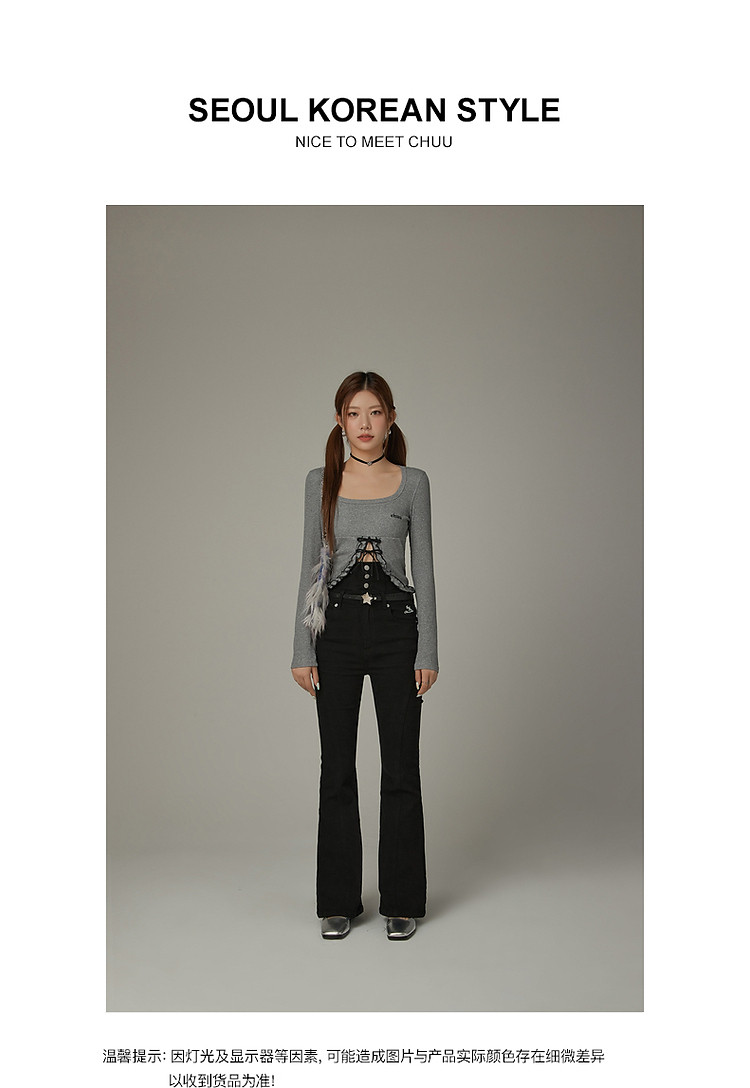 CHUU字母绣花长袖T恤女春秋木耳边露腰系带短上衣 908819