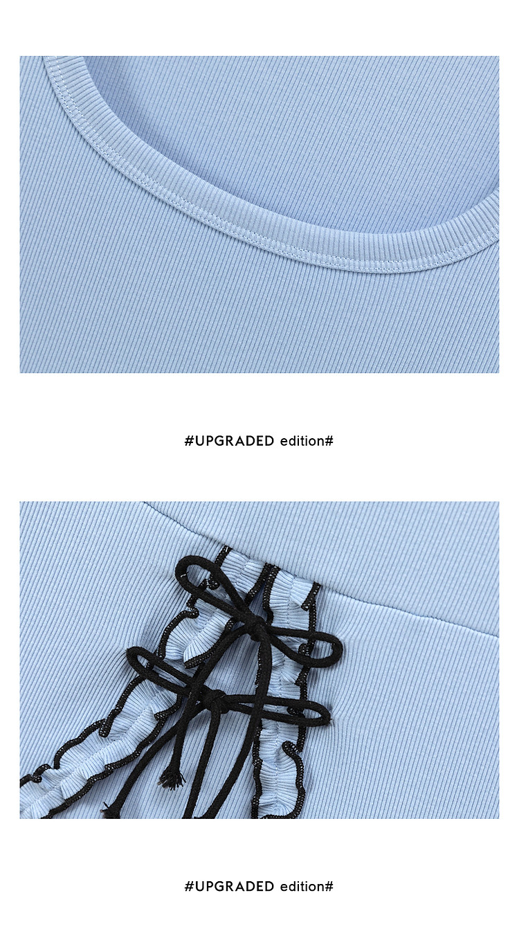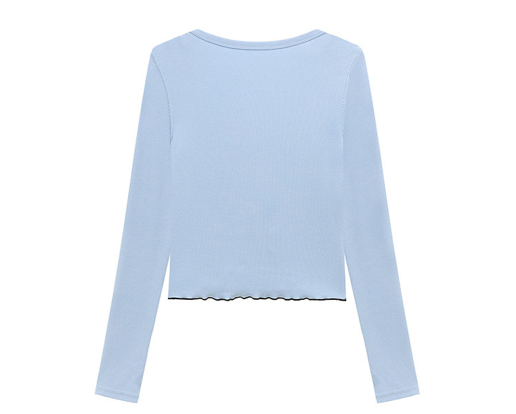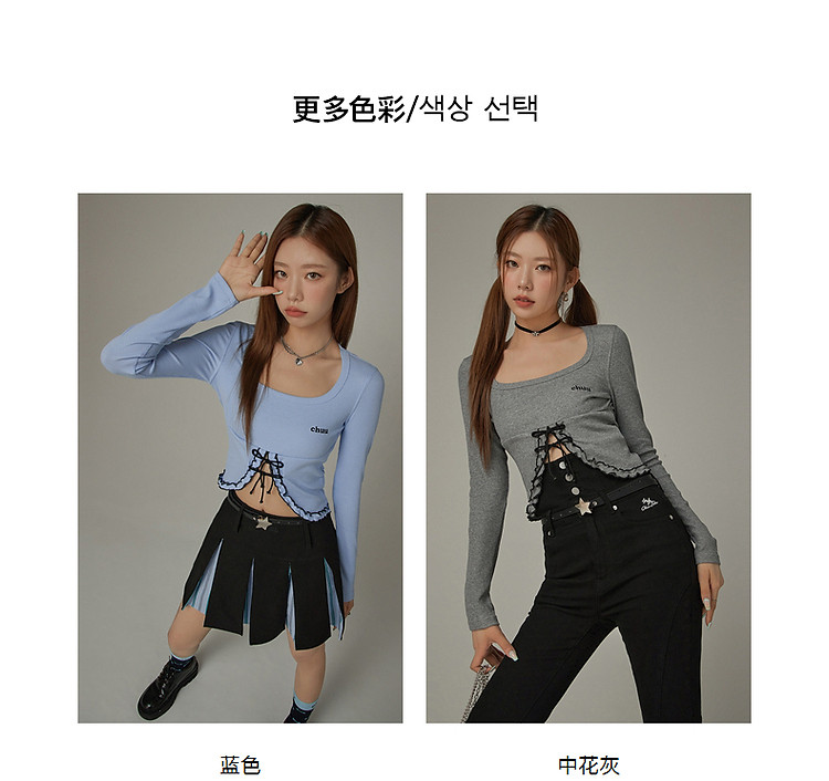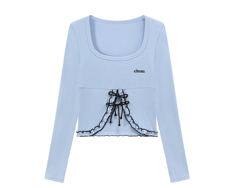 商品名称:CHUU字母绣花长袖T恤女春秋木耳边露腰系带短上衣 908819