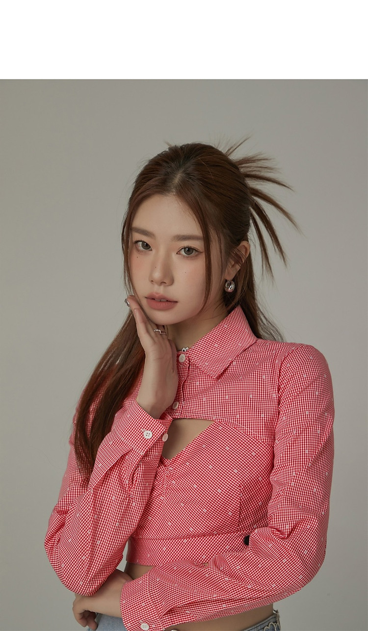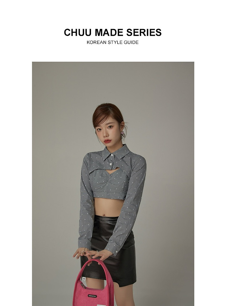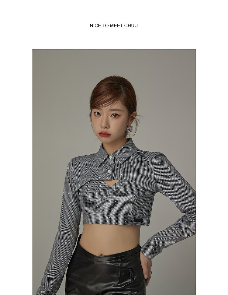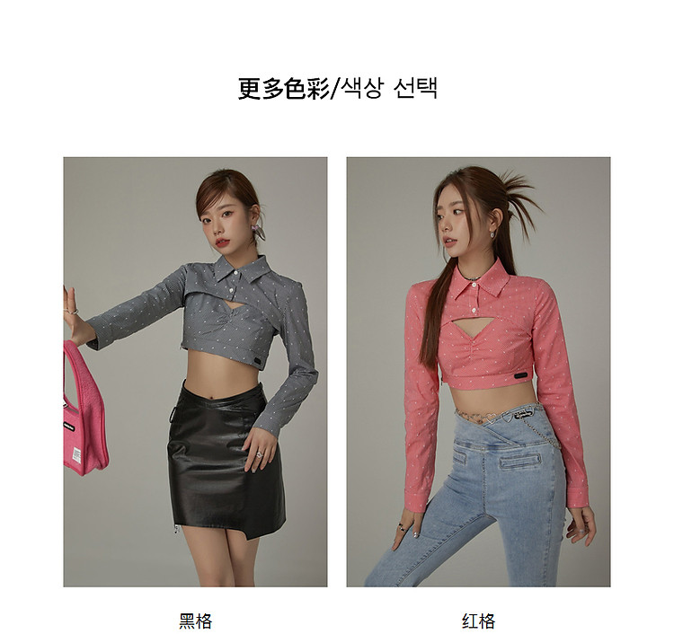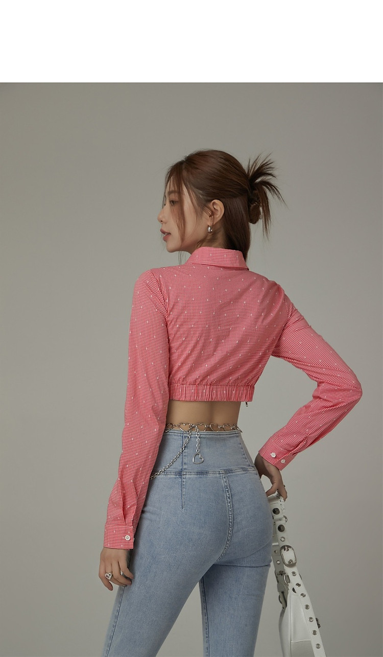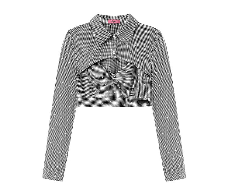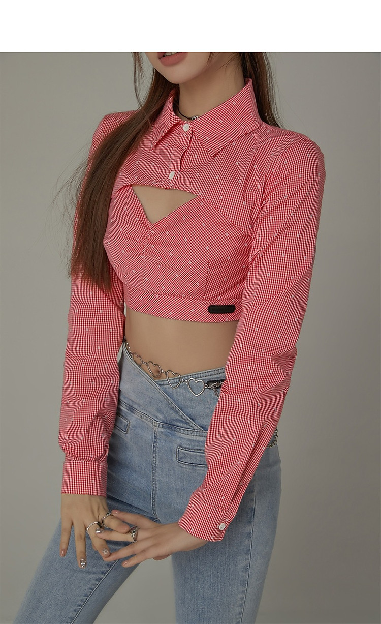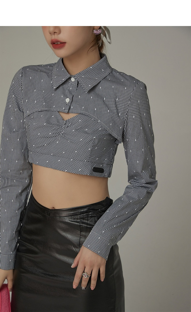 商品名称:辣妹镂空衬衫女夏设计感个性显瘦格子长袖短款上衣 423635