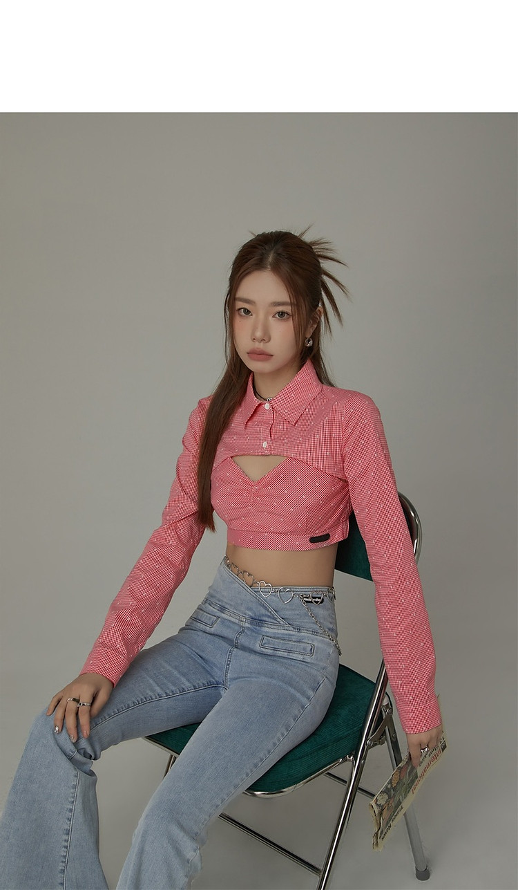 辣妹镂空衬衫女夏设计感个性显瘦格子长袖短款上衣 423635
