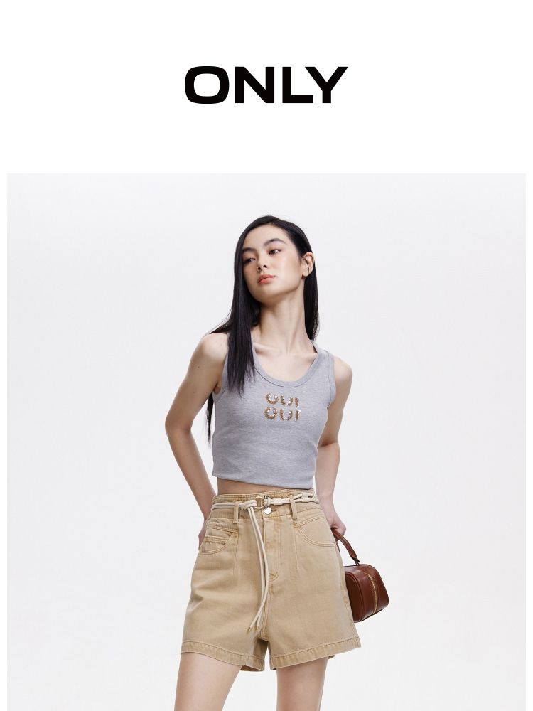 高腰叶子刺绣钉珠个性设计短裤直筒裤夏季休闲女式牛仔裤 061149