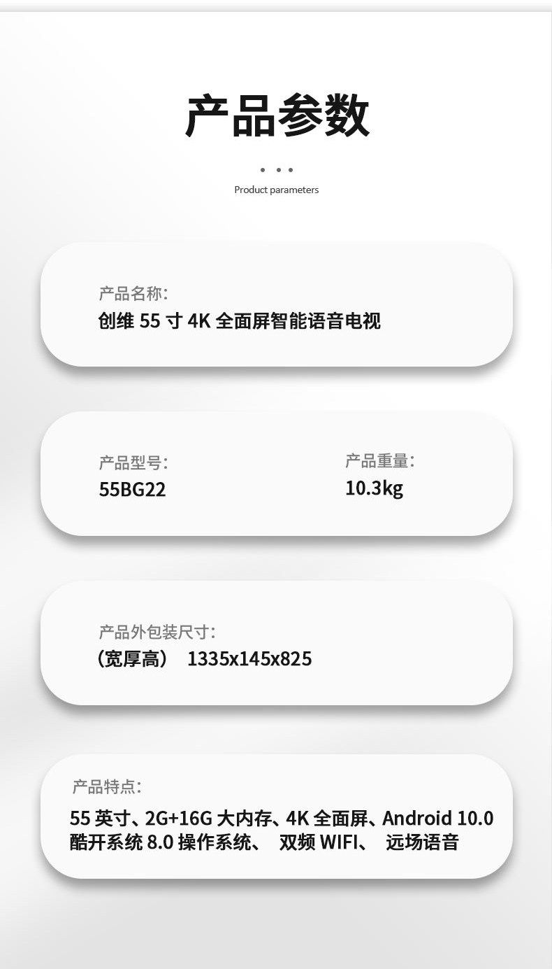 商品名称:创维电视55英寸高清无界全面屏智能液晶电视机55BG22(专供款)