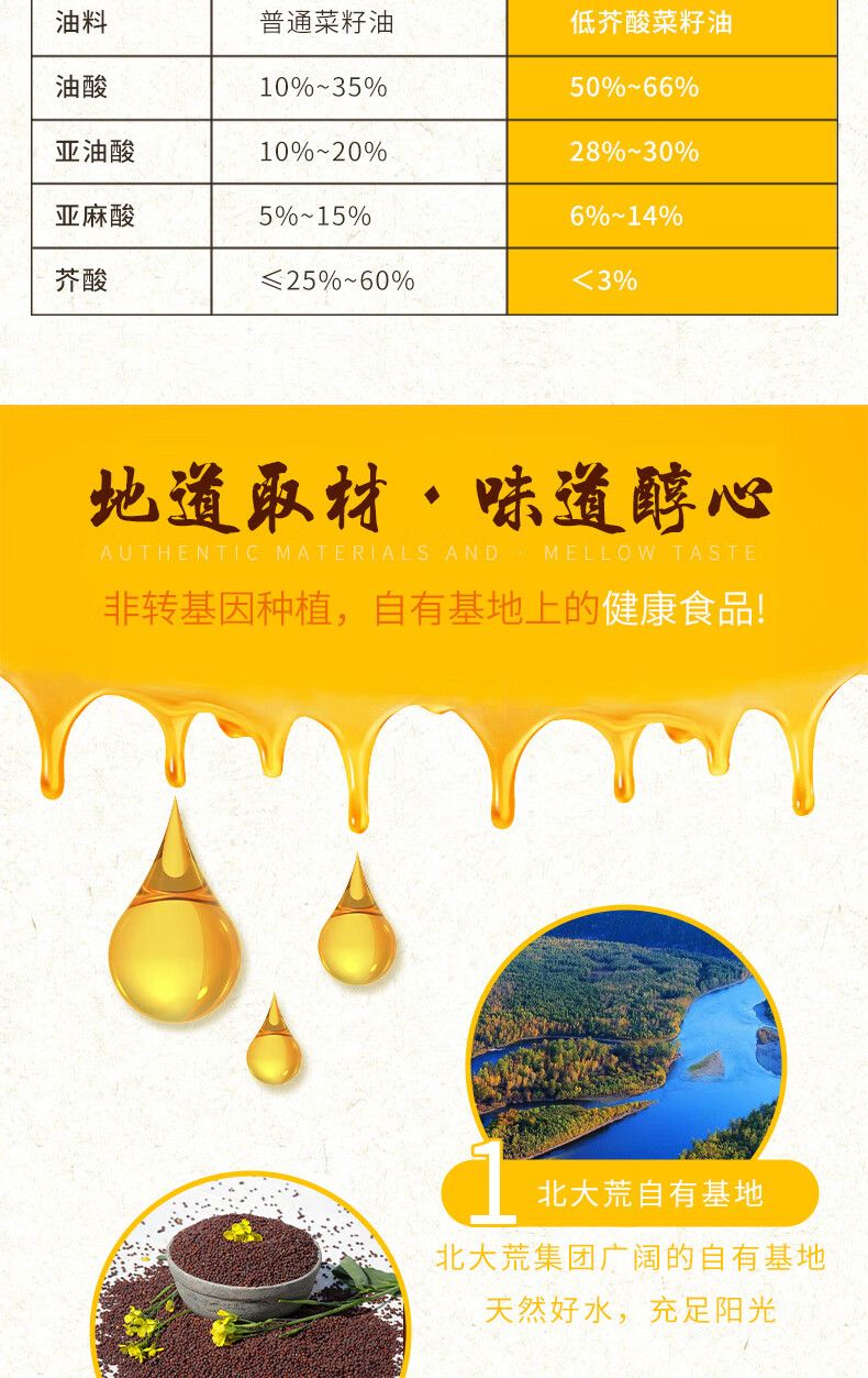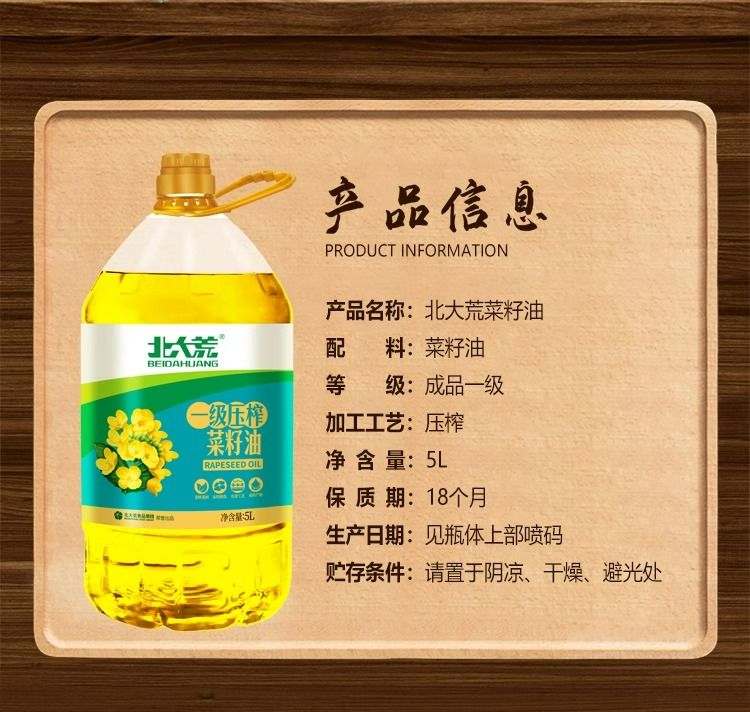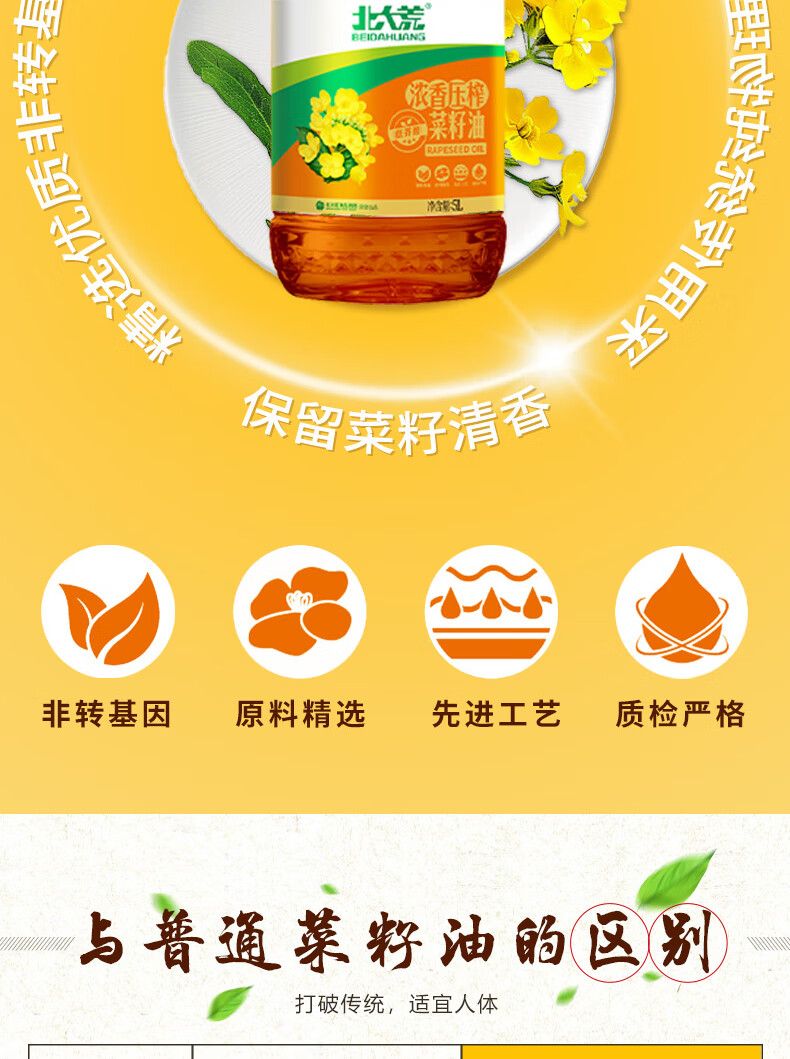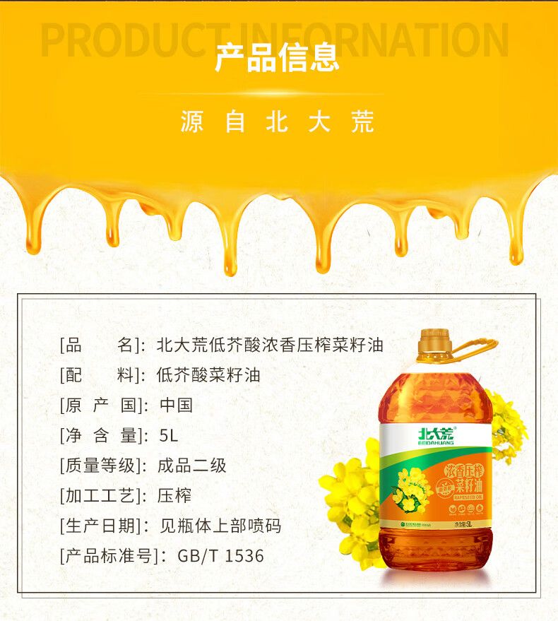商品名称:北大荒一级 非转基因 低芥酸 压榨莱籽油 家庭装 5L桶装 新日期家用食用油食品送礼