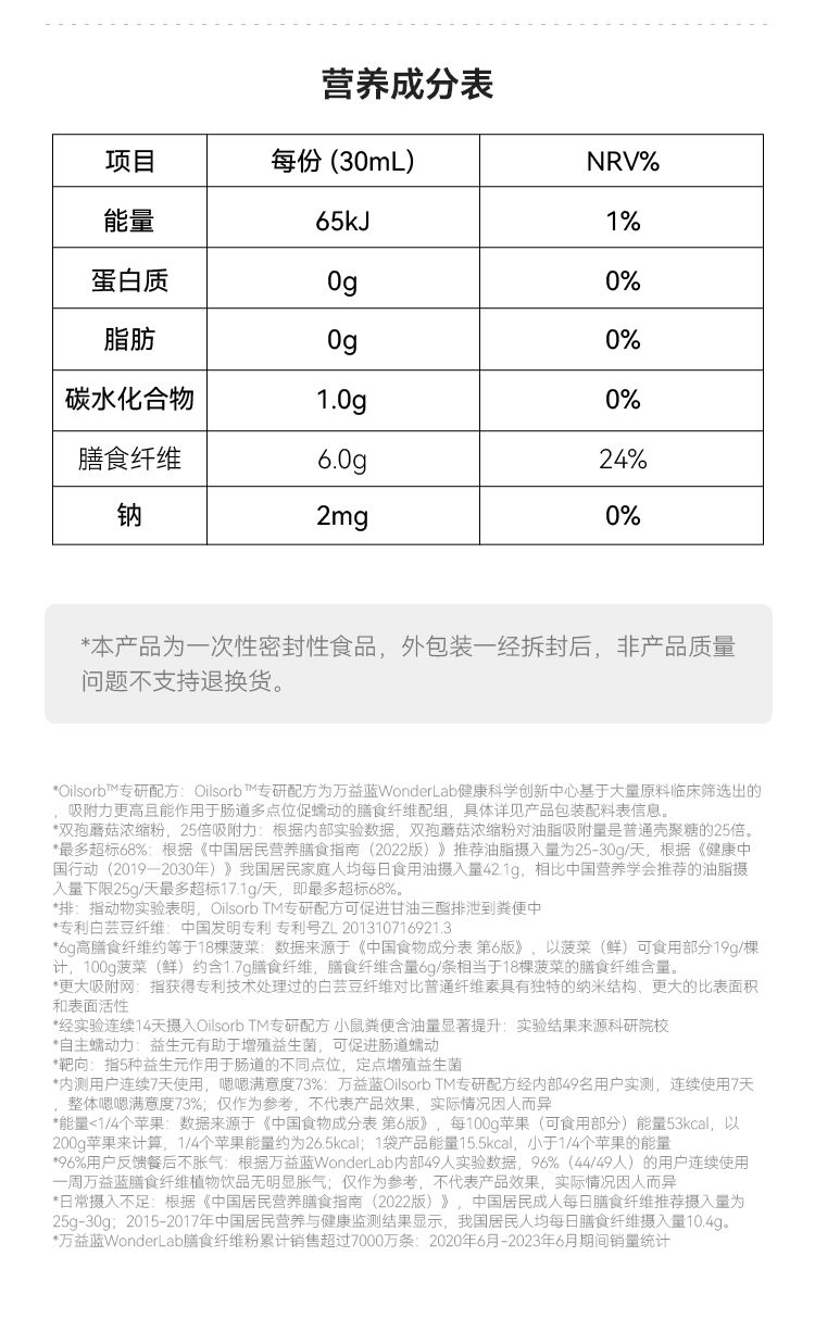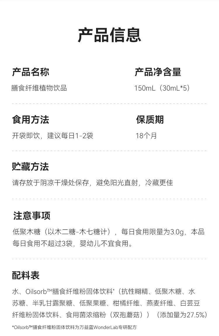 商品名称:万益蓝WonderLab 膳食纤维大餐排油植物饮品 原味(30ml*5袋)