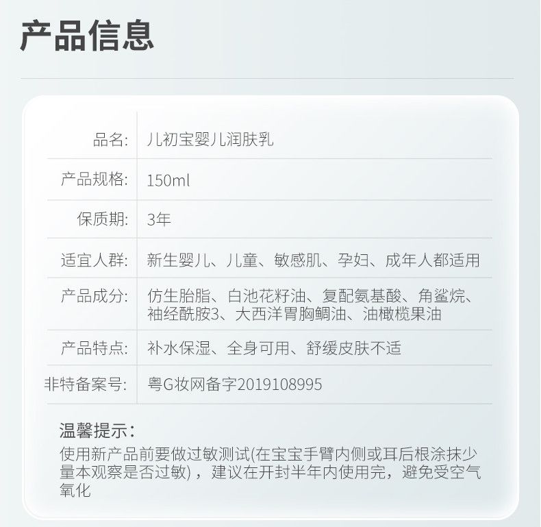 商品名称:BABETRUE儿初宝 婴幼儿润肤乳(150ml/瓶)