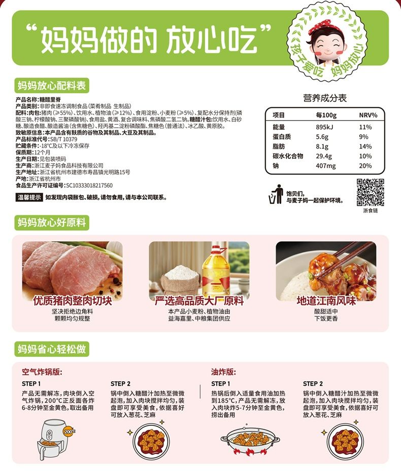商品名称:麦子妈糖醋里脊 酸甜味 冷冻速食 儿童喜爱预制菜 可空气炸锅