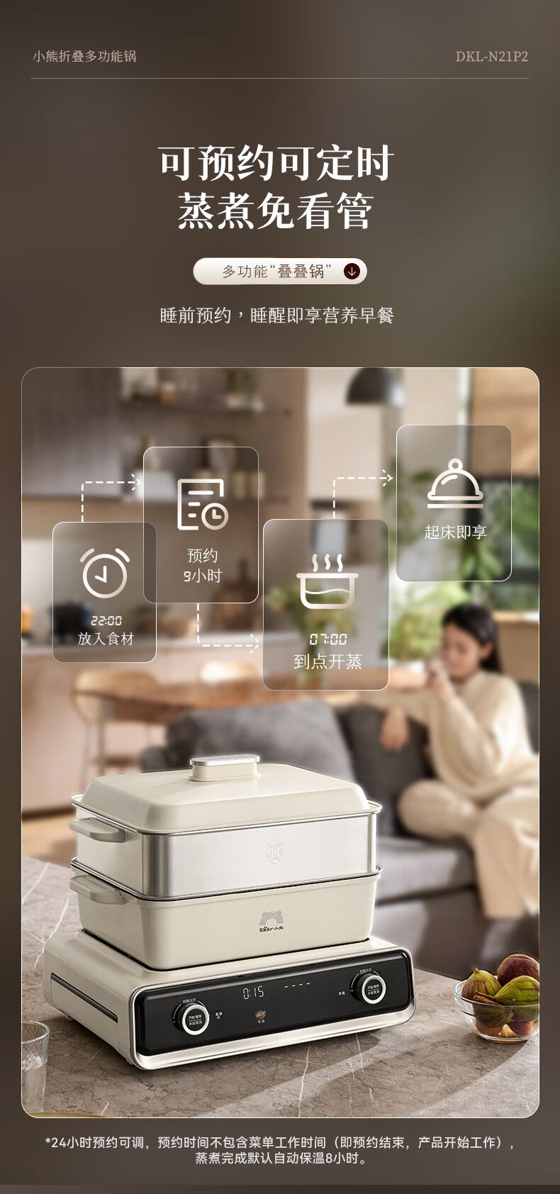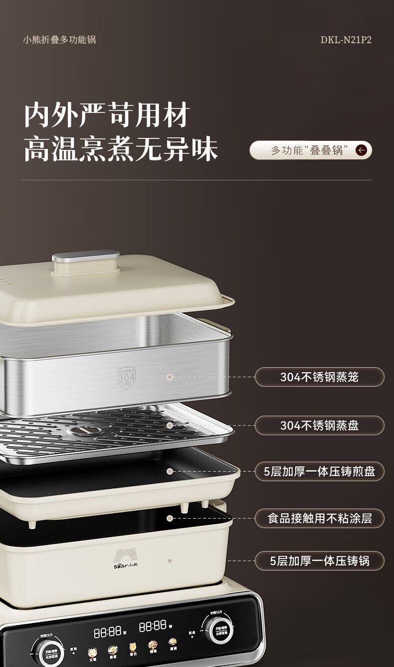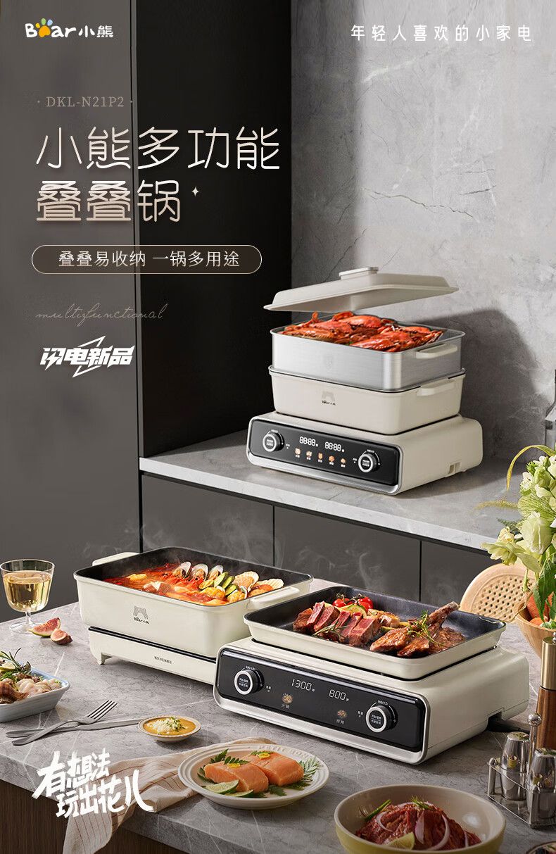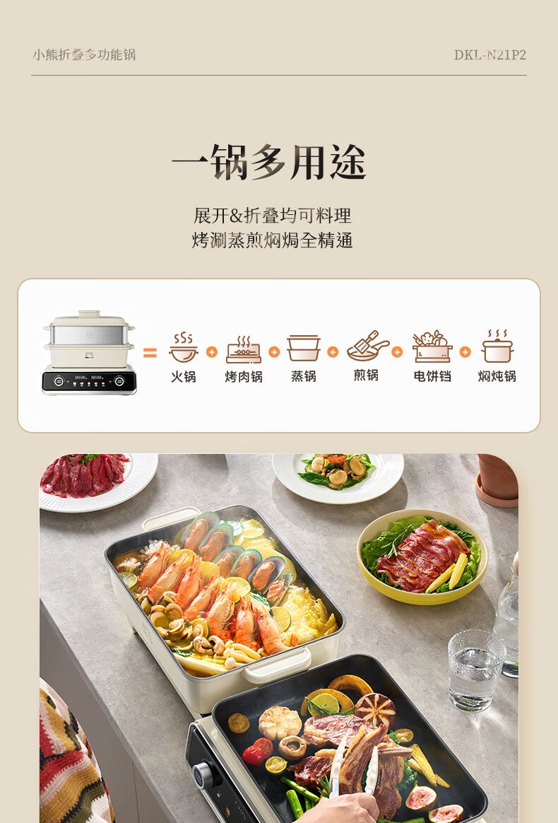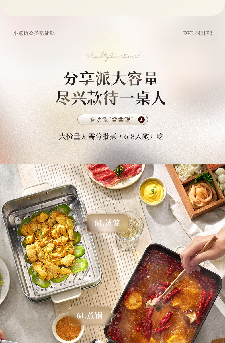 小熊叠叠锅DKL-N21P2 折叠多功能锅 电蒸锅电火锅 6L多用途烤涮一体家用料理锅烤肉锅电烤盘
