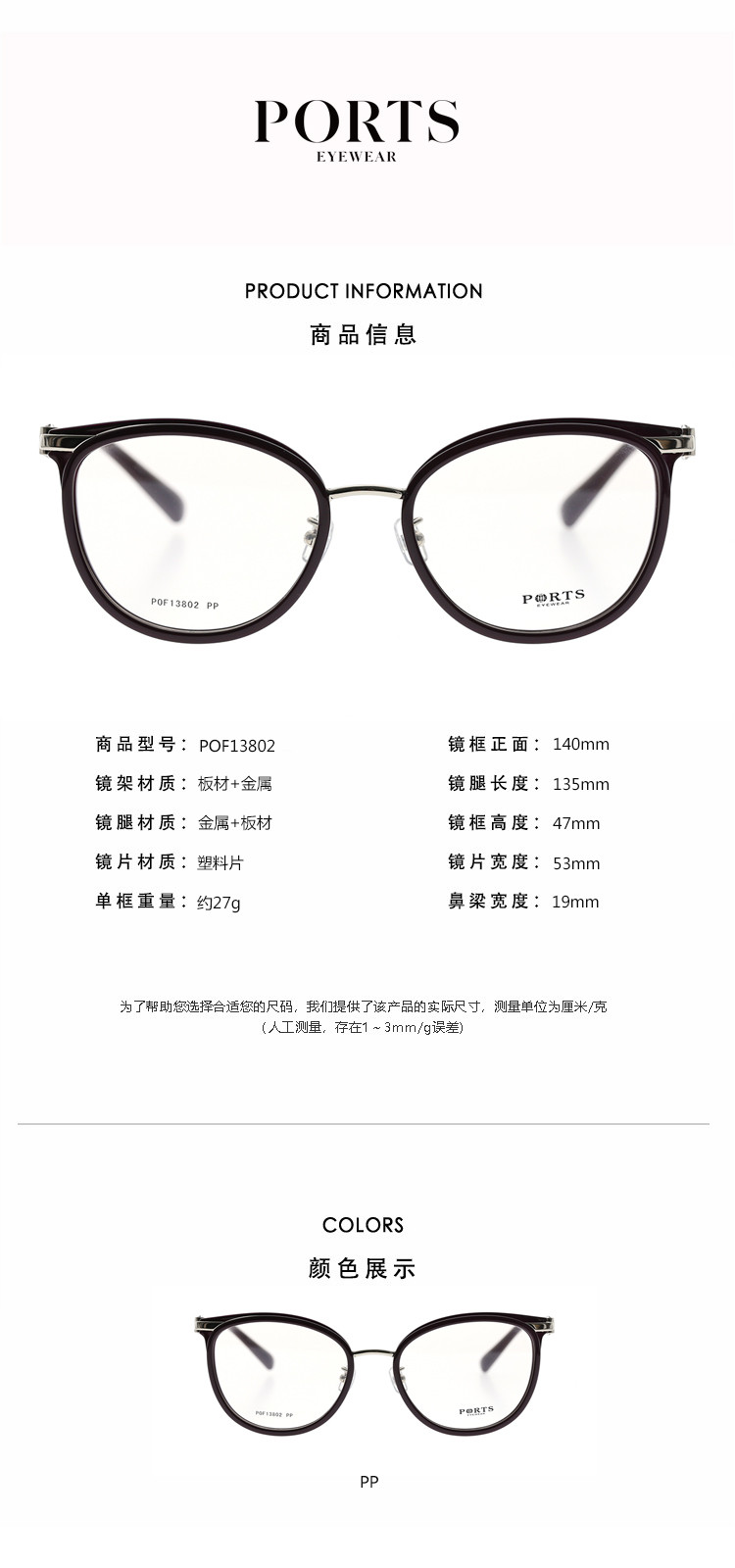 商品名称:PORTS女款经典板材优雅女士全框眼镜光学架POF13802 866122