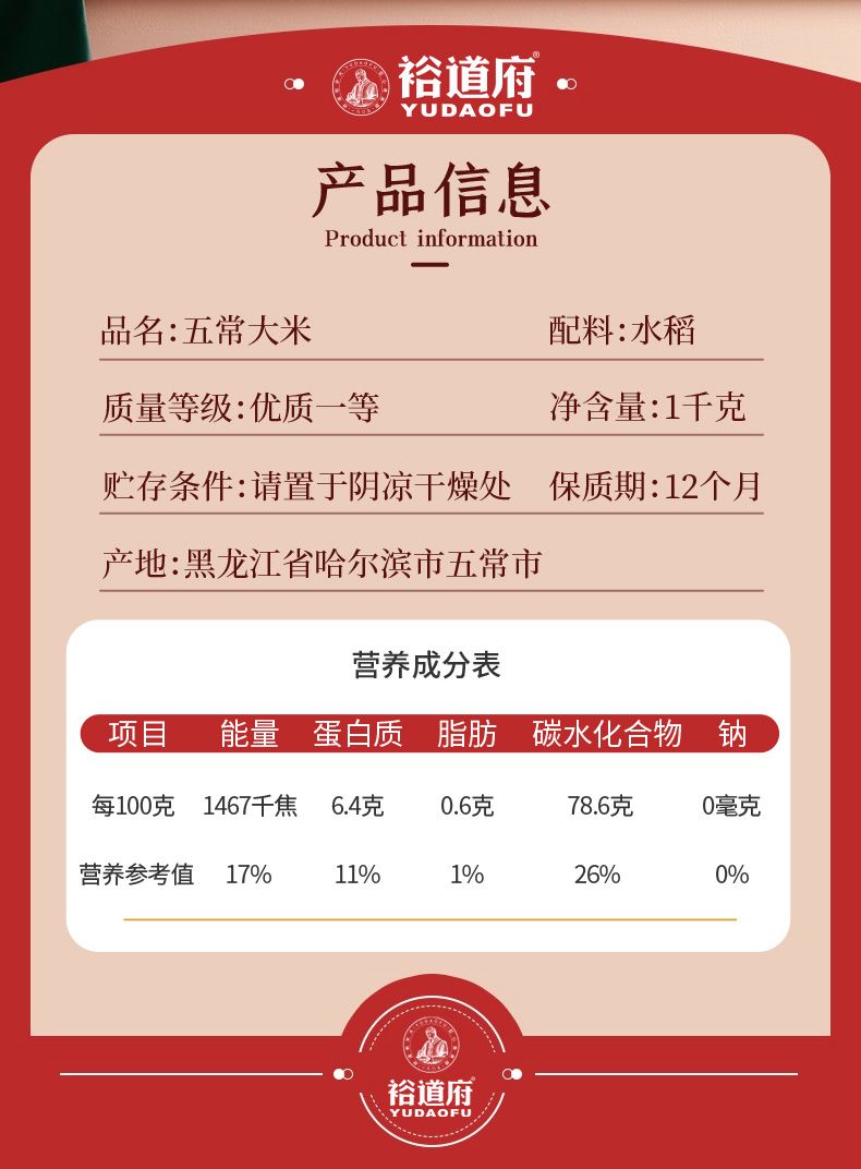 商品名称:裕道府 五常大米1kg 米掌柜系列