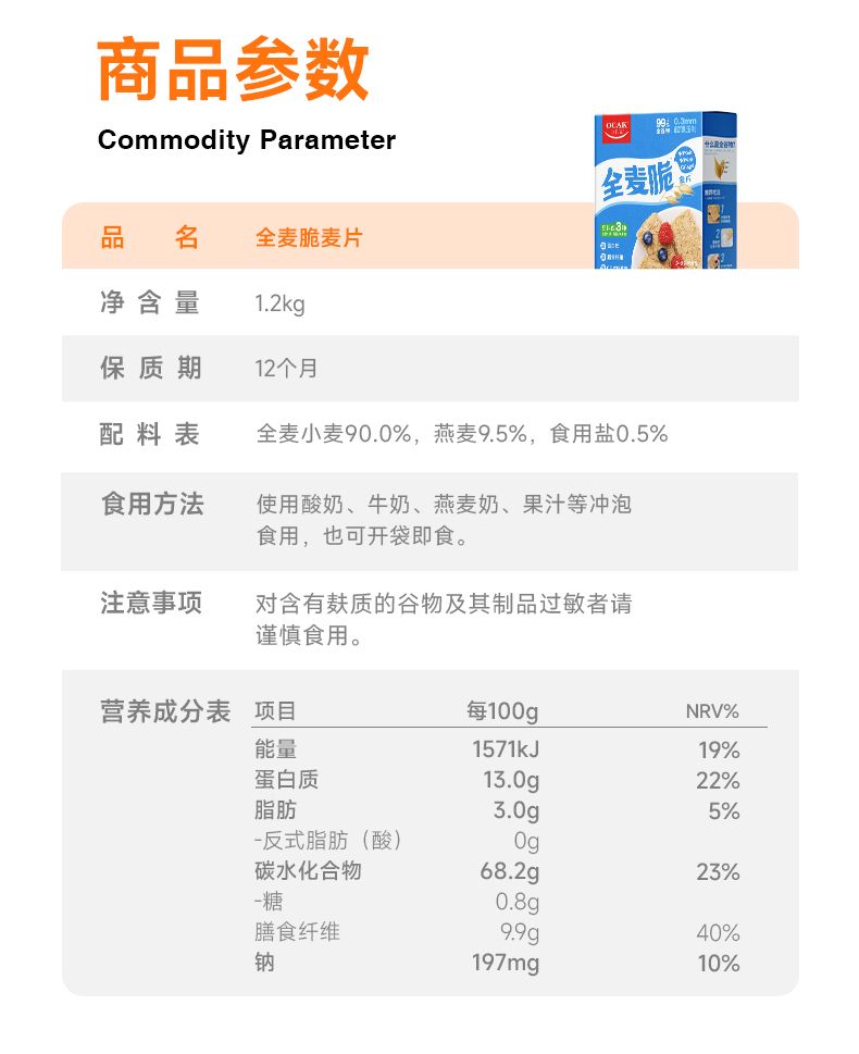 商品名称:1.2千克欧扎克全麦脆麦片(0添加蔗糖)+120克奇亚籽8黑/9红随机即食冲调麦片*2