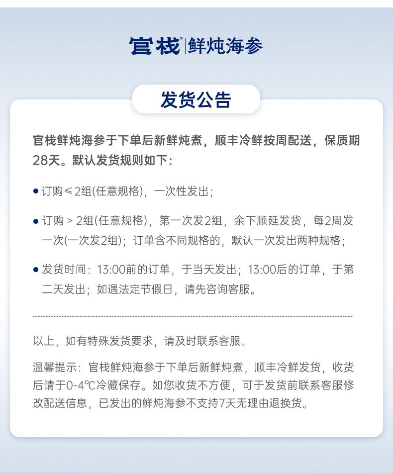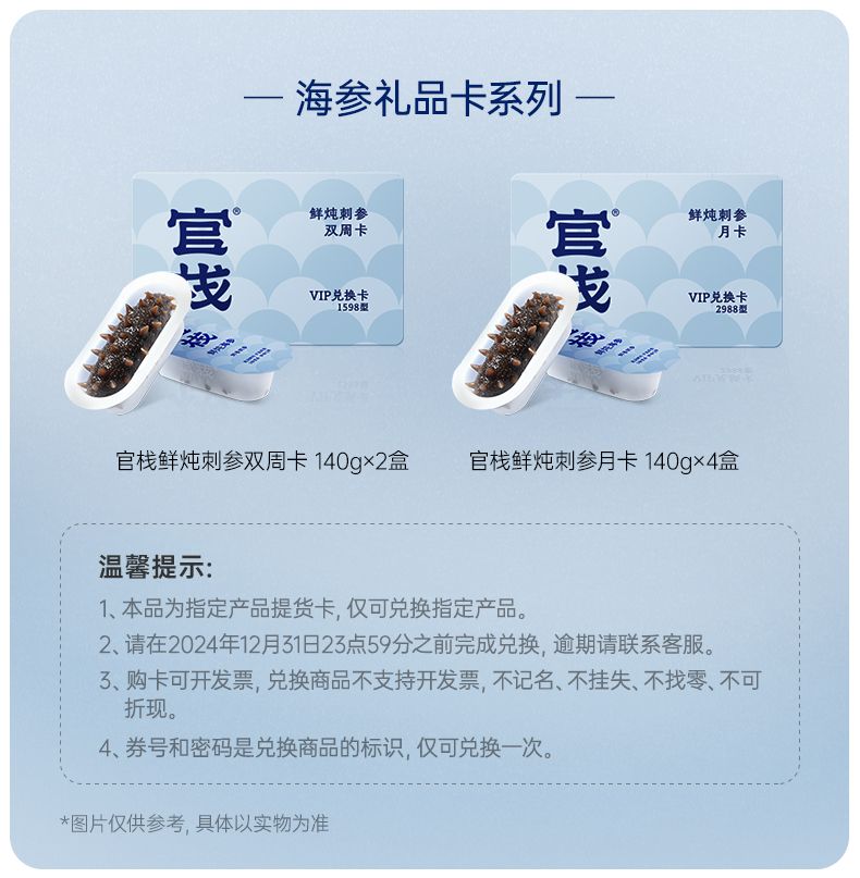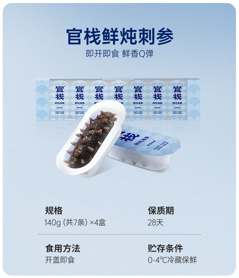商品名称:官栈鲜炖海参·鲜香刺参140g*4盒【月卡】80207060002