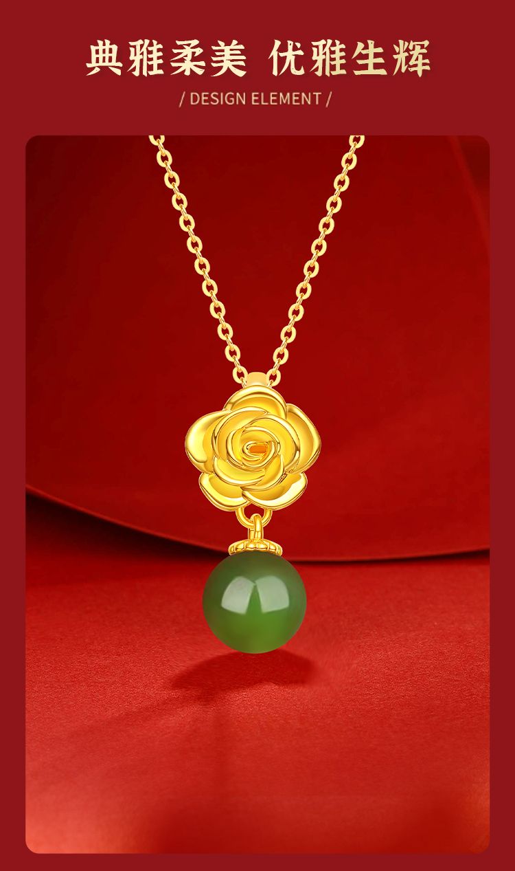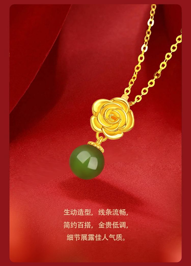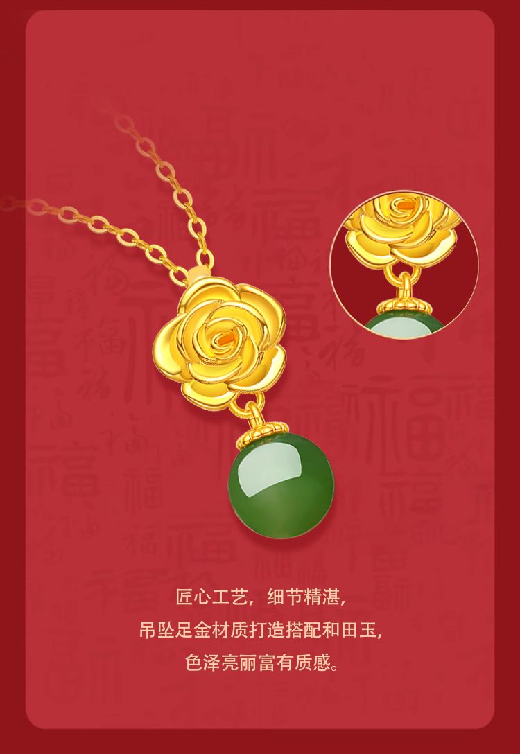 周六福足金牡丹亭和田碧玉吊坠
