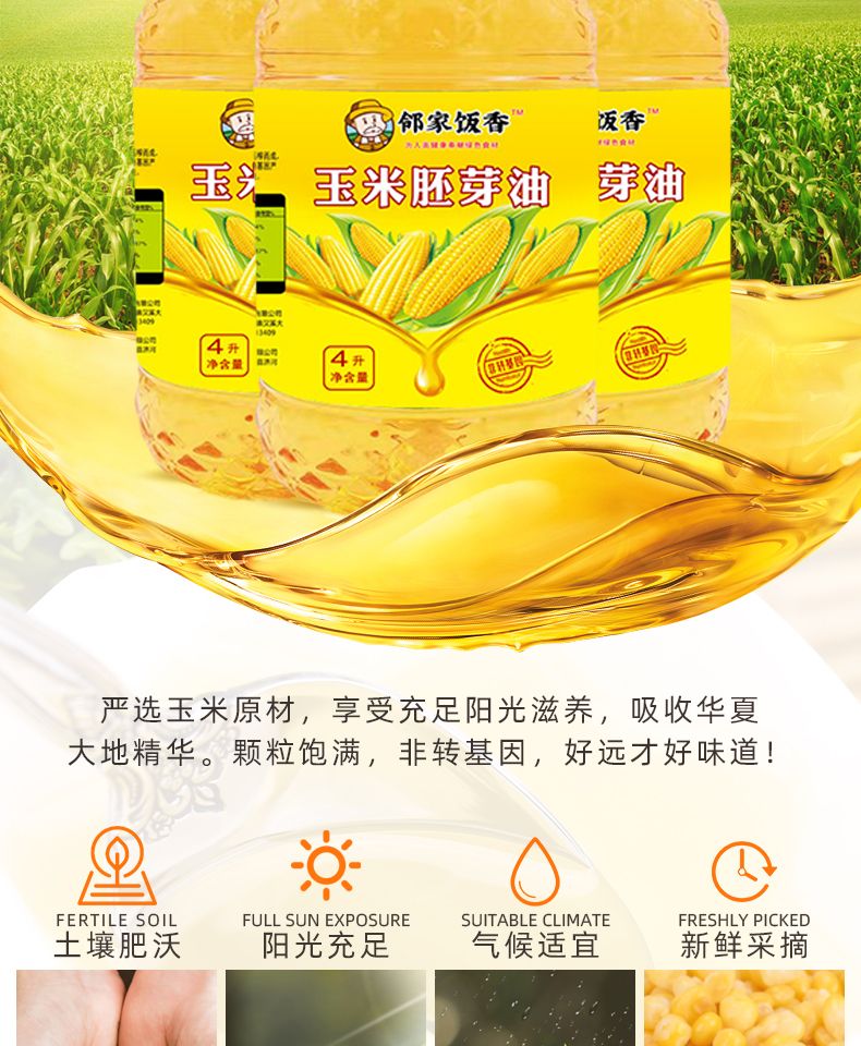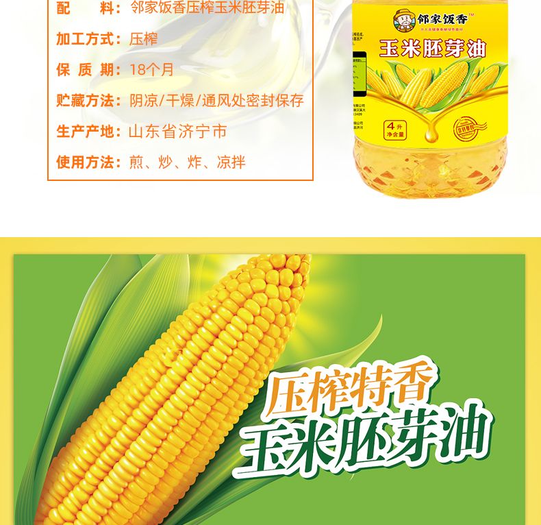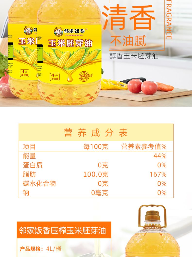 商品名称:邻家饭香 压榨一级玉米胚芽油 非转基因 4L/桶 LJFX129