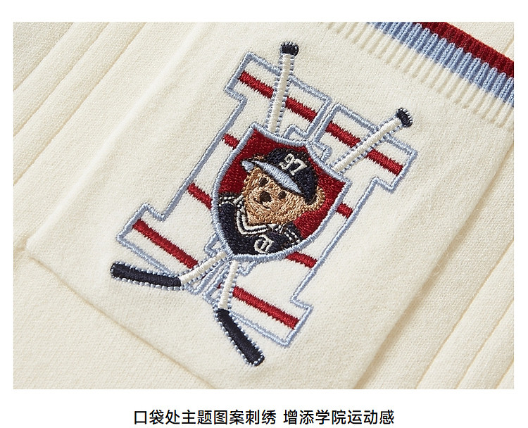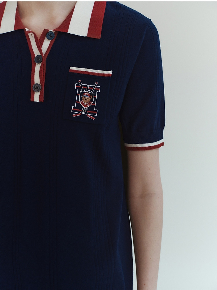 小熊气质学院风撞色Polo领短袖毛针织连衣裙 030913