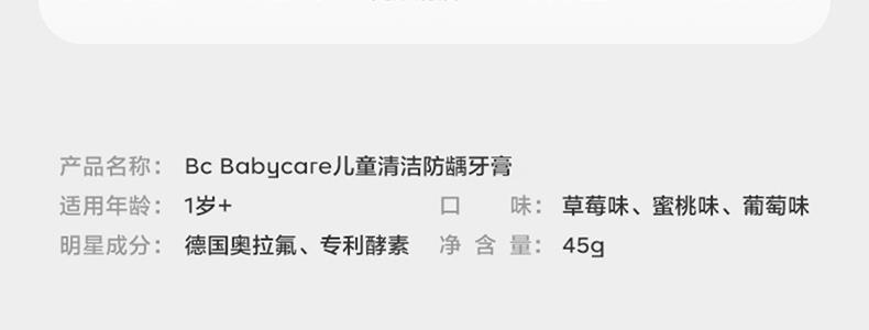 商品名称:Babycare 儿童清洁防龋牙膏 蜜桃味 45g/盒