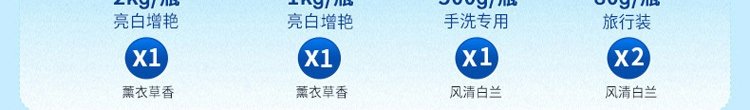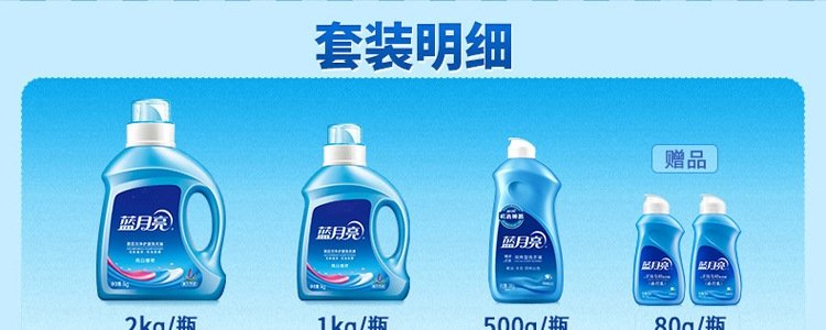 商品名称:蓝月亮 洗衣液套装7.32斤(亮白增艳2kg+亮白增艳1kg+手洗专用500g+赠手洗专用旅行装80g*2瓶))