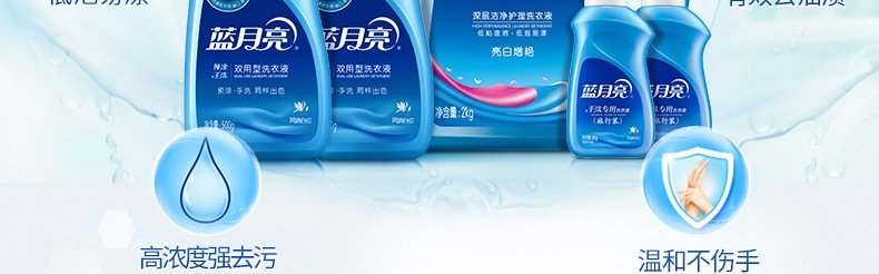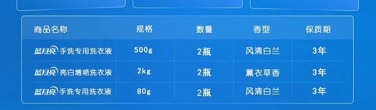 商品名称:蓝月亮 洗衣液套装10.32斤(风清白兰500g*2瓶+手洗专用80g*2瓶+亮白增艳2kg*2瓶)