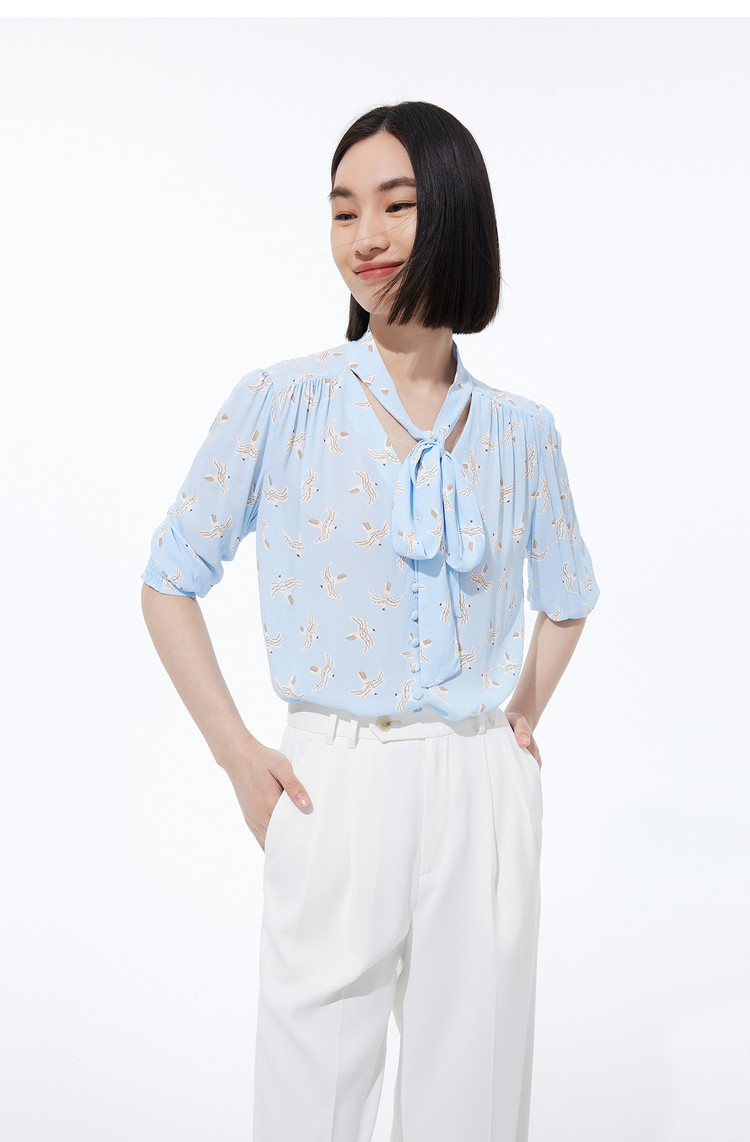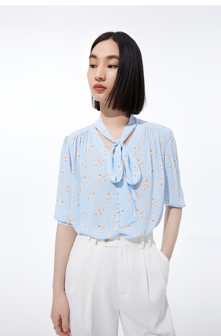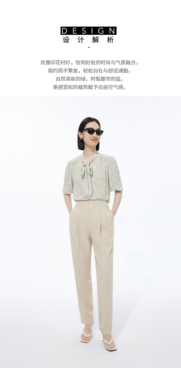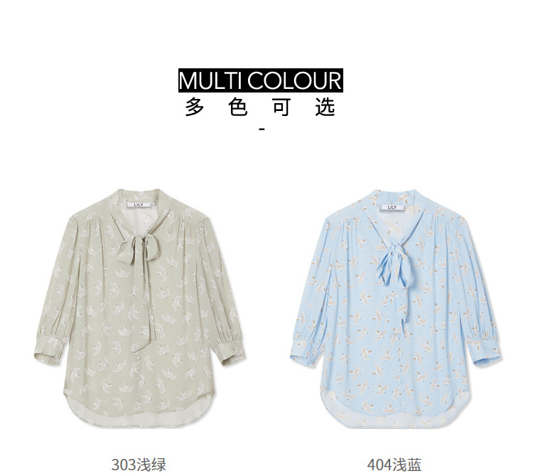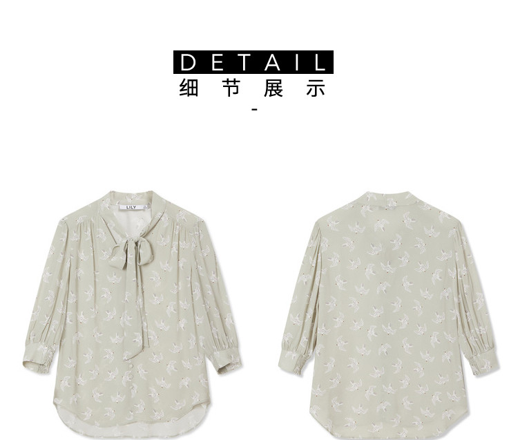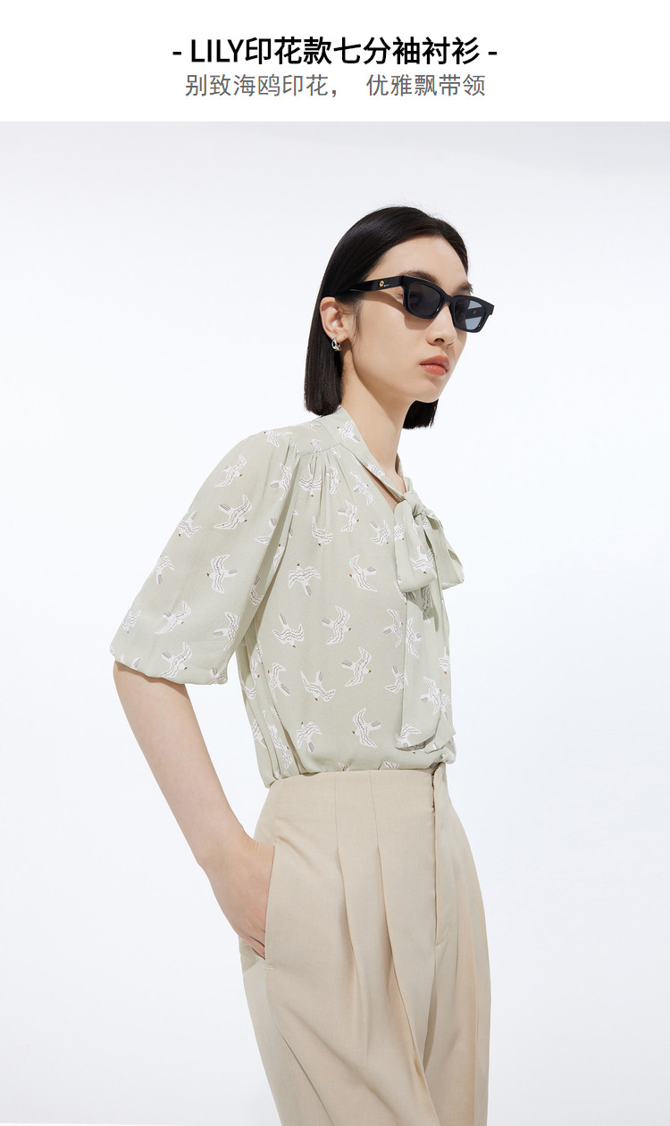 商品名称:【薄荷曼波】春季上衣女垂坠人丝印花飘带舒适宽松七分袖衬衫女 493275