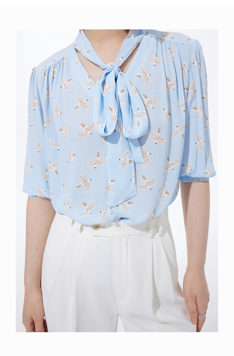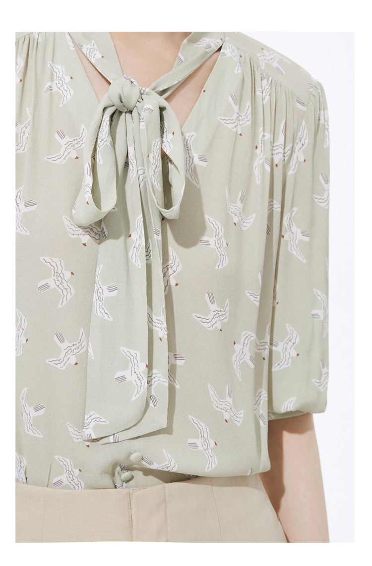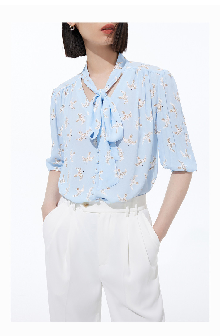 【薄荷曼波】春季上衣女垂坠人丝印花飘带舒适宽松七分袖衬衫女 493275