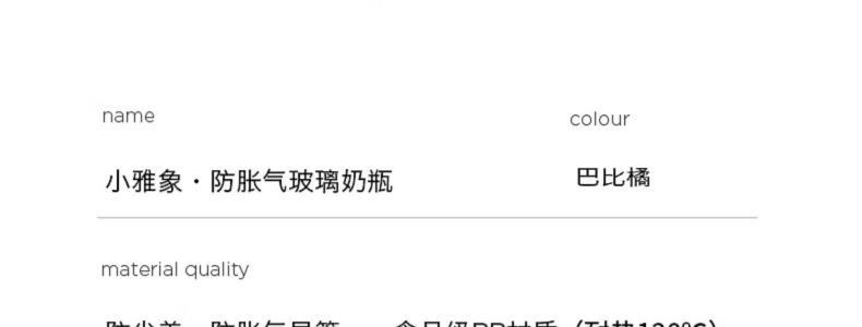 商品名称:小雅象(Phanpy)防胀气玻璃奶瓶 自带L号奶嘴 240ml 巴比橘 (6-9个月)