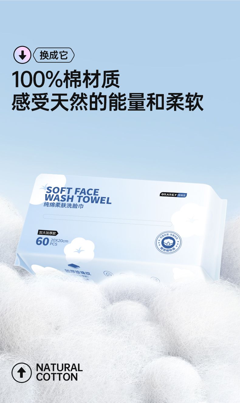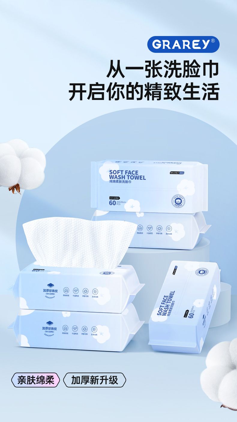 商品名称:格瑞亚纯绵柔肤洗脸巾 60抽/包 *5包