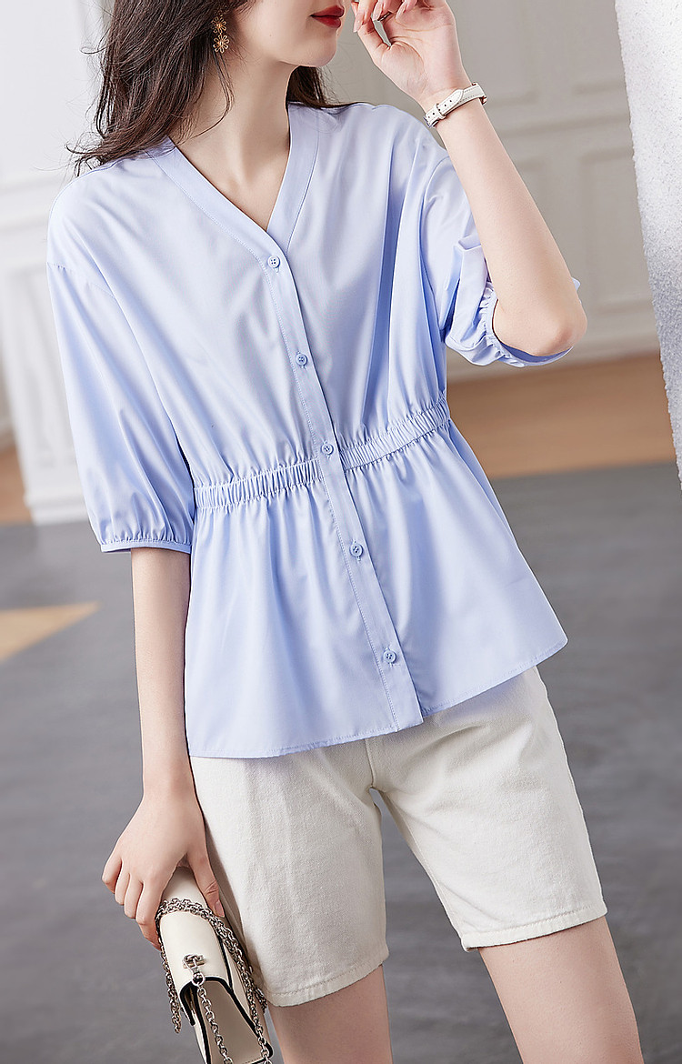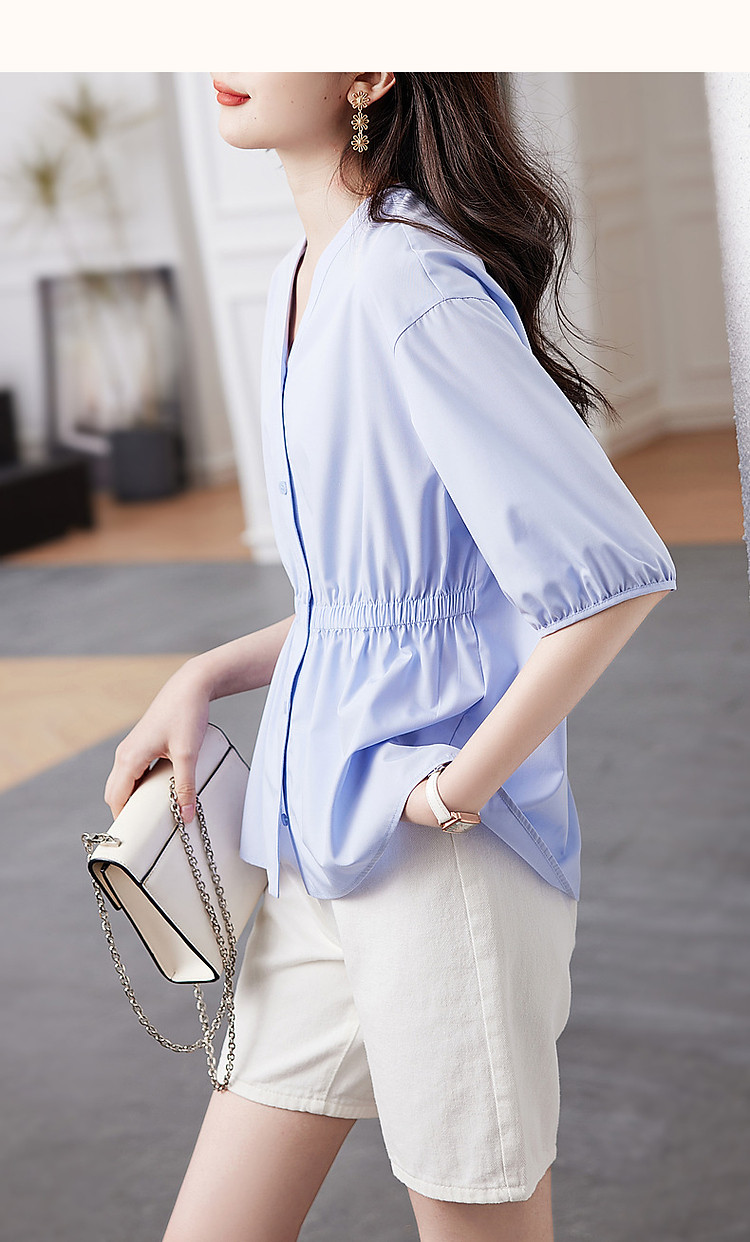 【清冷小白花】夏季简约风V领衬衫立裁松紧舒适藏肉衬衣女装上衣 742593