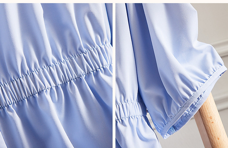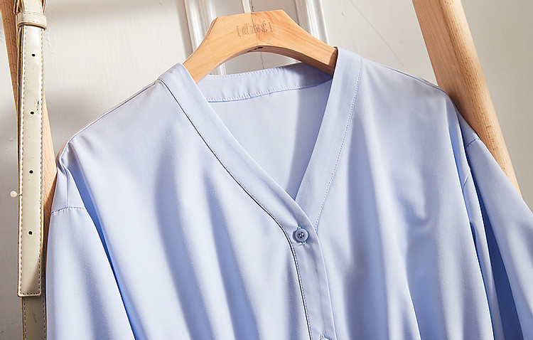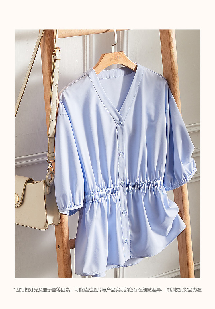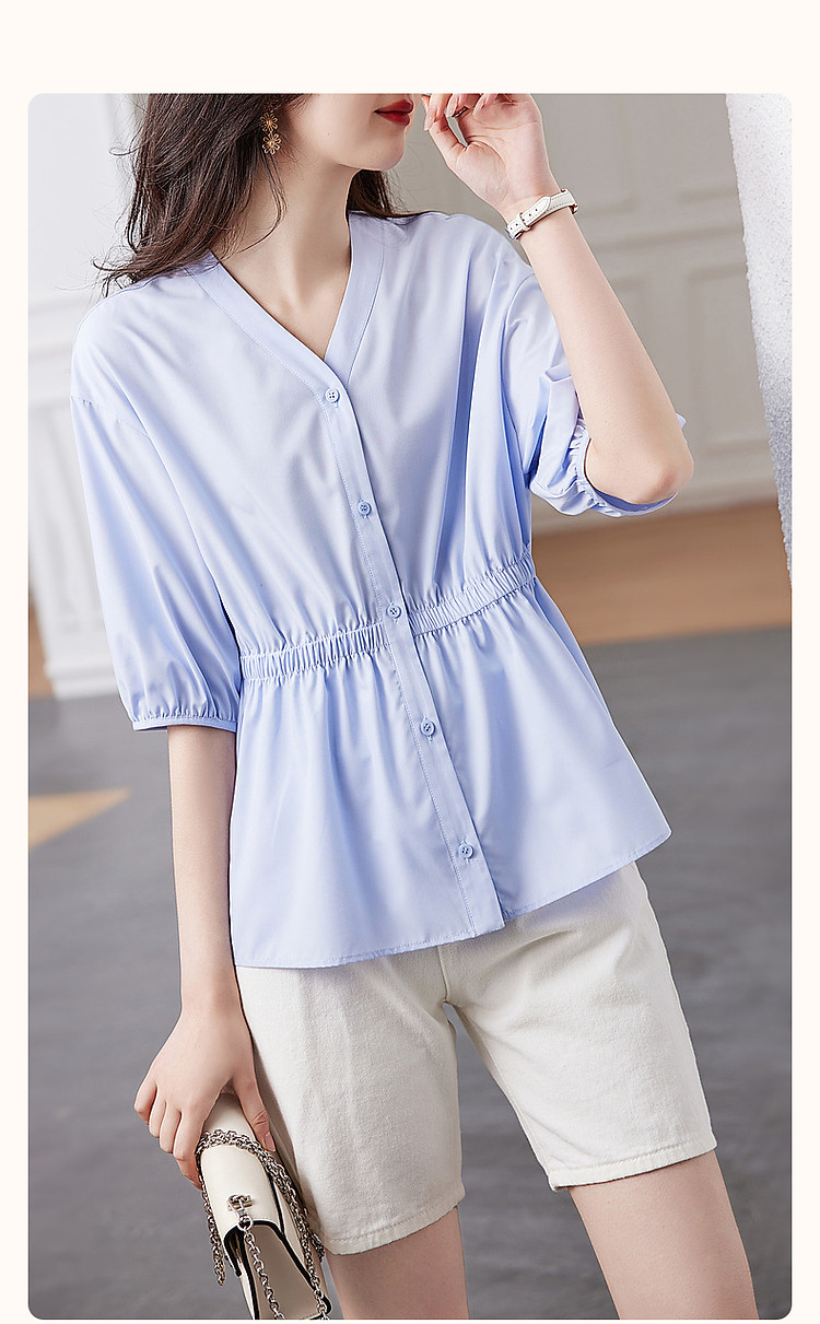 商品名称:【清冷小白花】夏季简约风V领衬衫立裁松紧舒适藏肉衬衣女装上衣 742593
