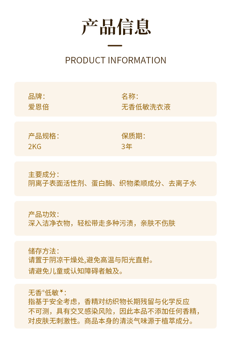 商品名称:爱恩倍无香洗衣液低敏无添加婴儿孕妇专用深层洁净家用实惠去污渍2KG桶装