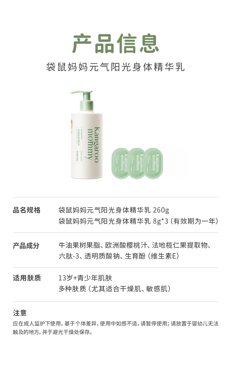 商品名称:【青少年身体乳】袋鼠妈妈青少年保湿身体乳润肤乳精华乳保湿乳清爽不黏腻260g送赠品