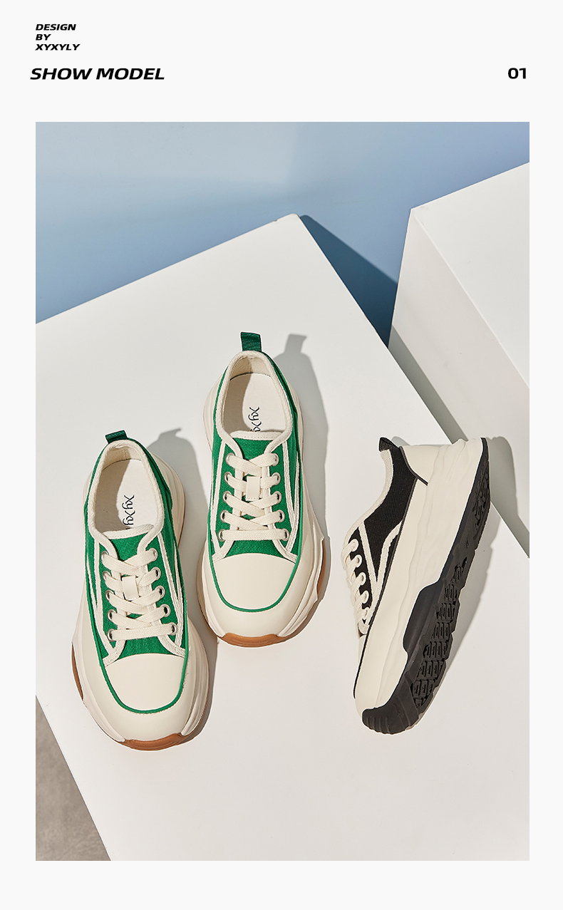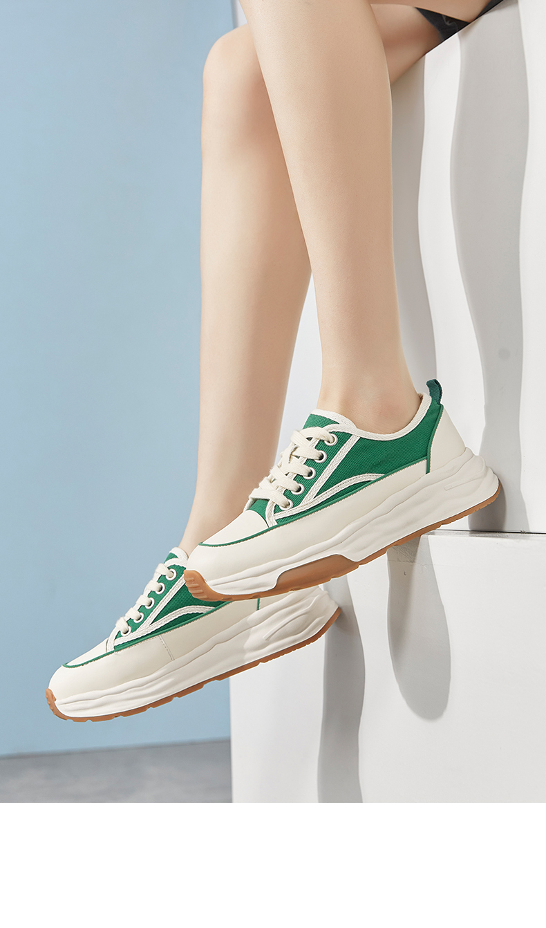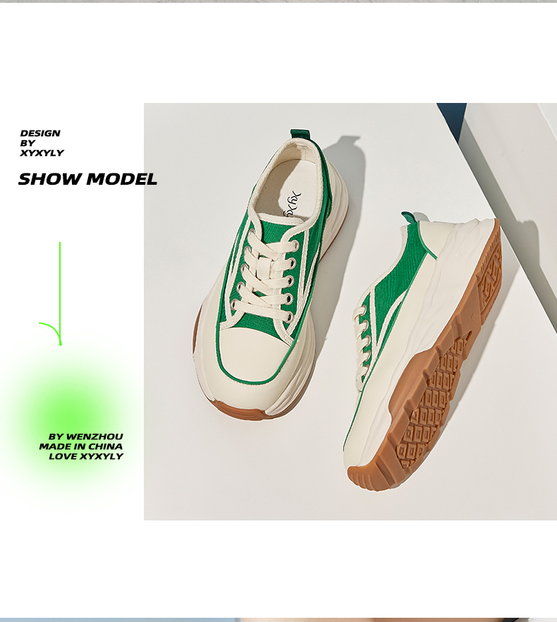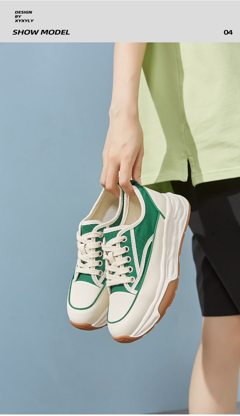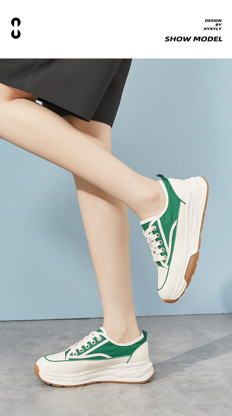 香香莉圆头系带帆布面料厚底时尚休闲鞋子青春洋溢绿色厚底增高休闲鞋