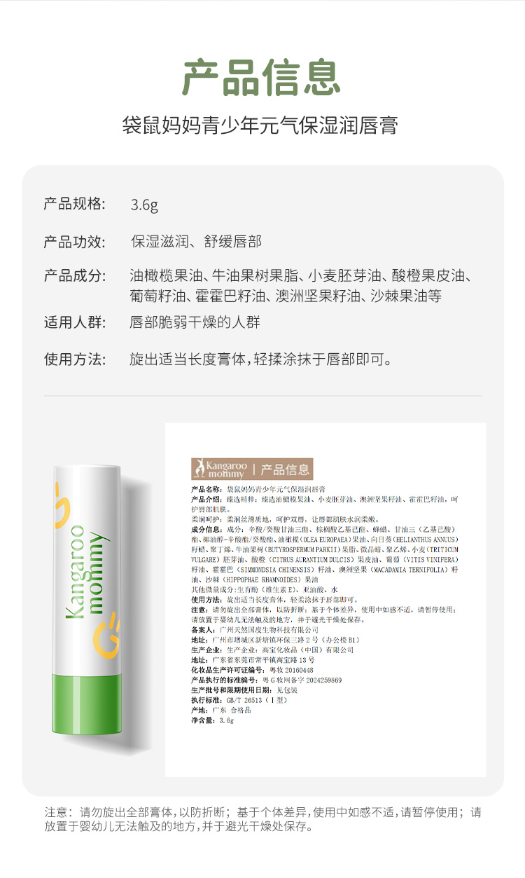 商品名称:【青少年润唇膏】袋鼠妈妈学生润唇膏秋冬保湿润唇护唇膏滋润轻盈保湿护唇3.6g