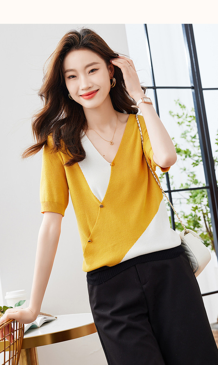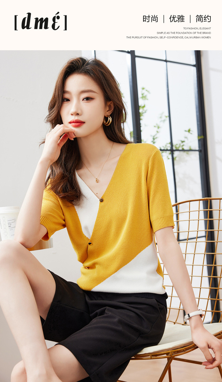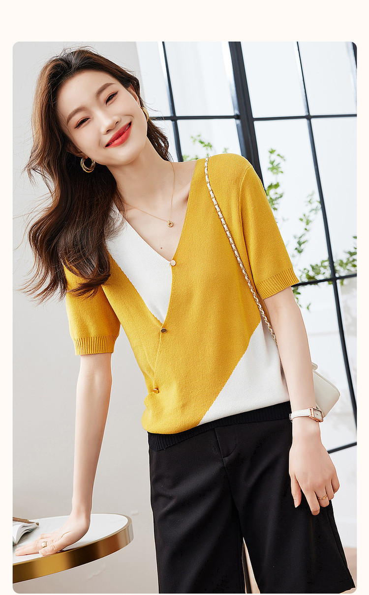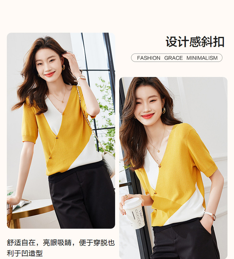 商品名称:【法式不规则拼色线衫】夏V领高弹柔软针织衫女上衣 955009