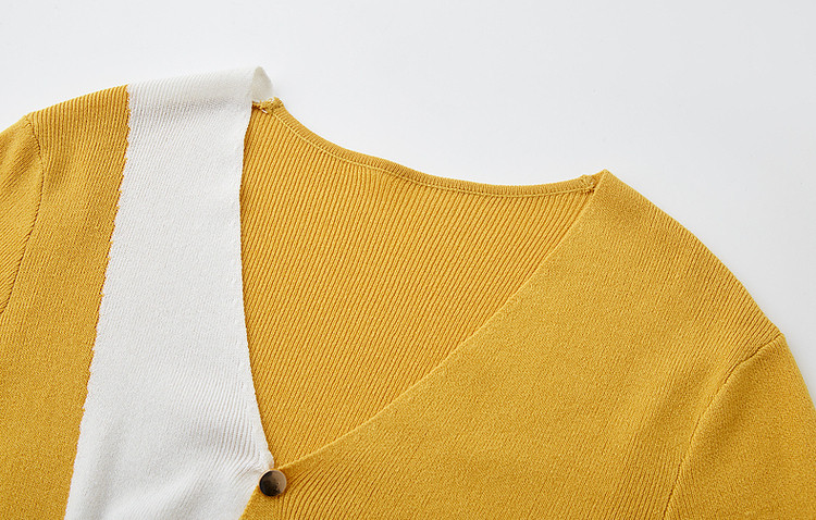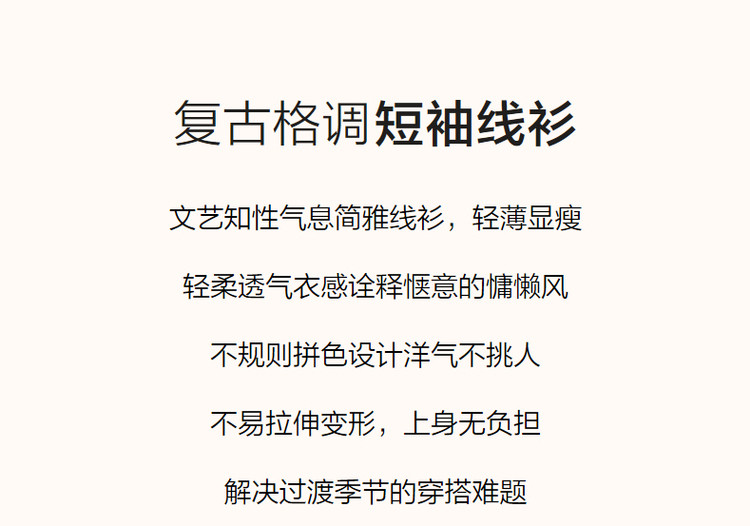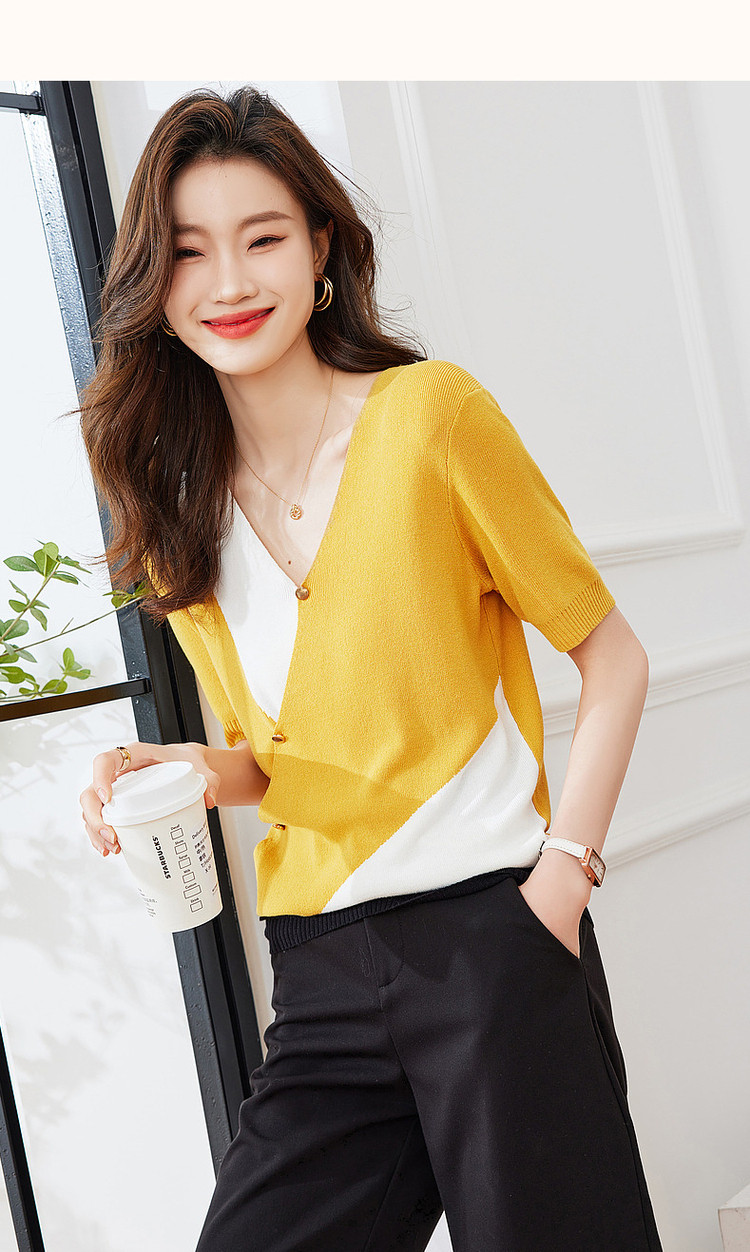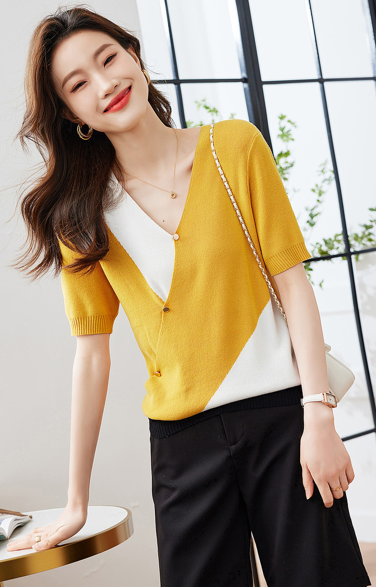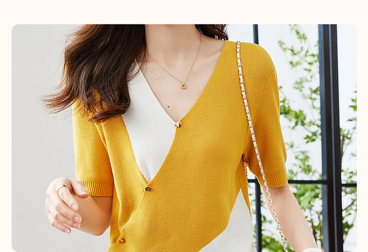 商品名称:【法式不规则拼色线衫】夏V领高弹柔软针织衫女上衣 955009