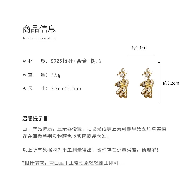 商品名称:彤彤兔 S925银针韩版甜美可爱小熊简约气质小众个性耳钉女网红款耳环