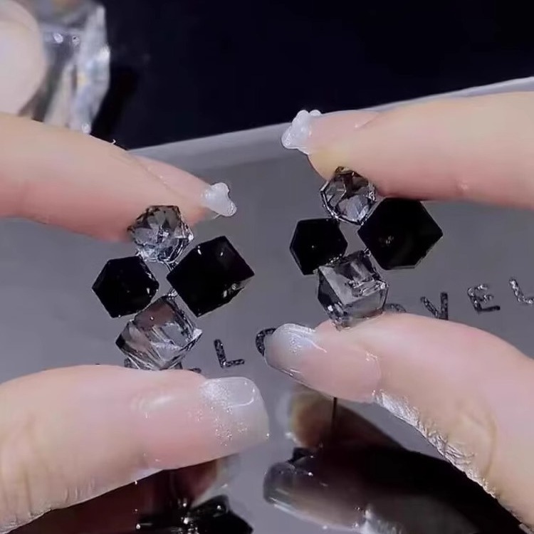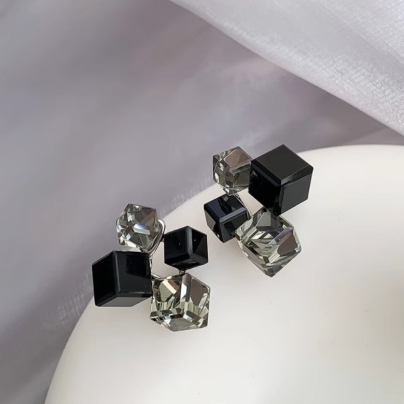 彤彤兔 S925银针复古风秋冬黑色立体钻几何耳环高级感小众设计潮人耳钉女