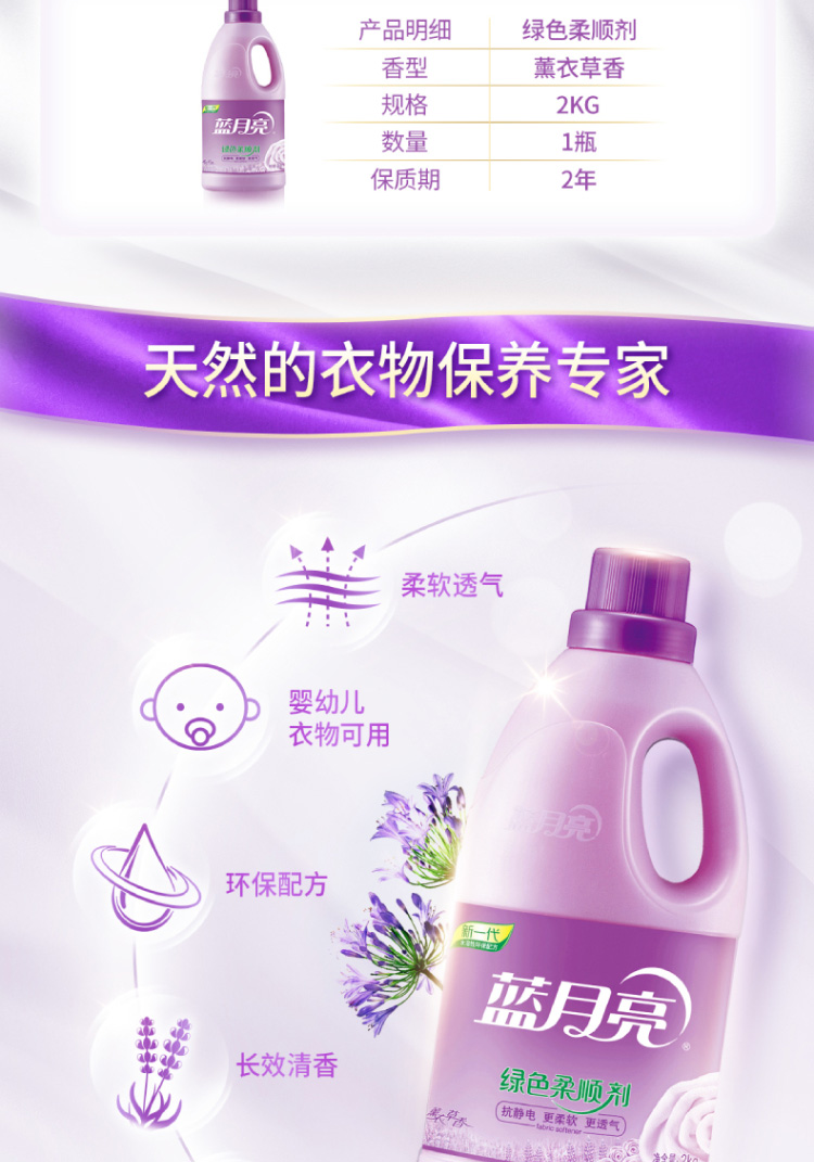 商品名称:蓝月亮 绿色柔顺剂(薰衣草)2kg 防静电环保长效清香成人儿童衣物柔顺剂