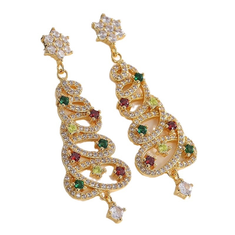 彤彤兔 S925银针欧美圣诞耳环彩色流苏圣诞树耳钉闪钻镂空长款耳饰品