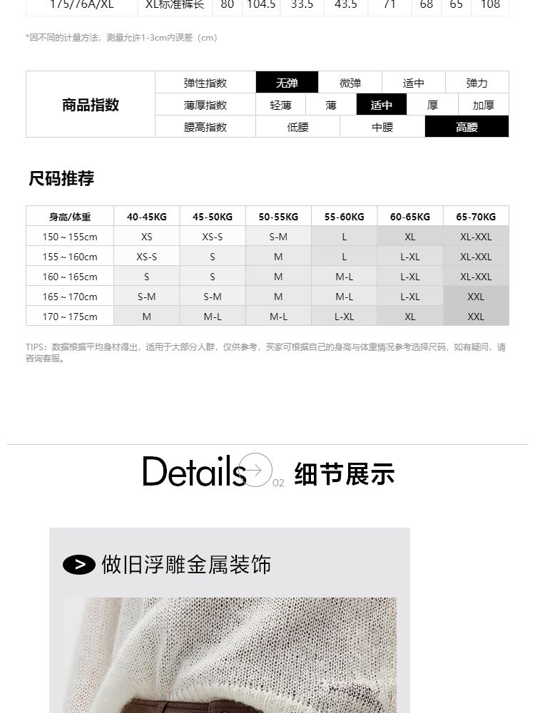 | S(标准裤长) | 65 | 68 | 101 | 92.5 | 160/64A |