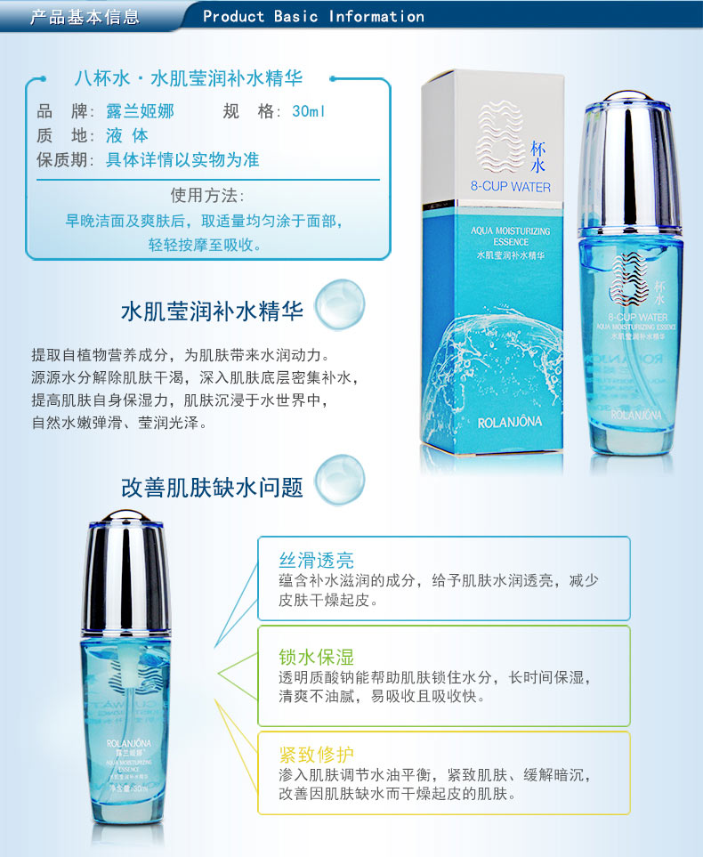 商品名称:露兰姬娜 八杯水水肌莹润补水精华 补水保湿 渗透锁水 30ml