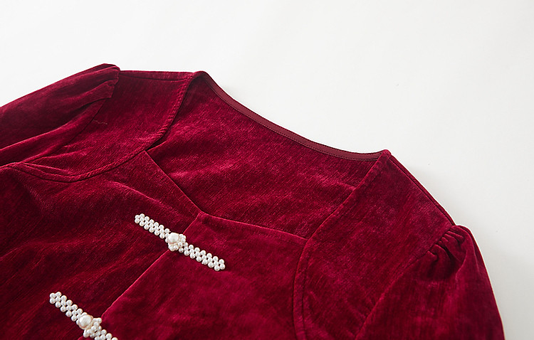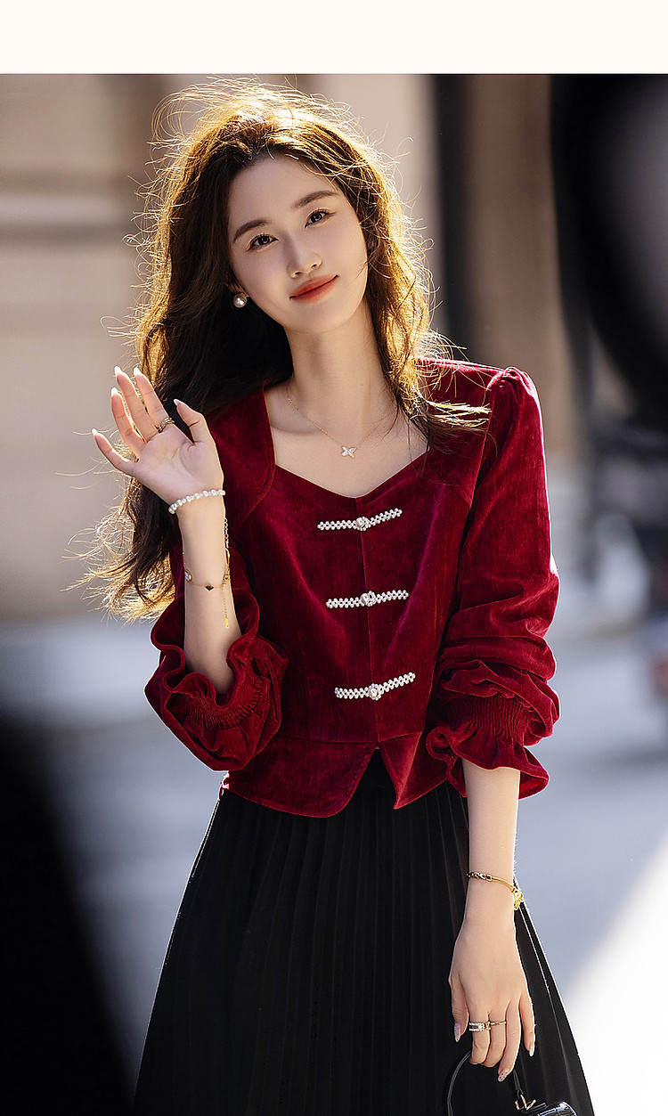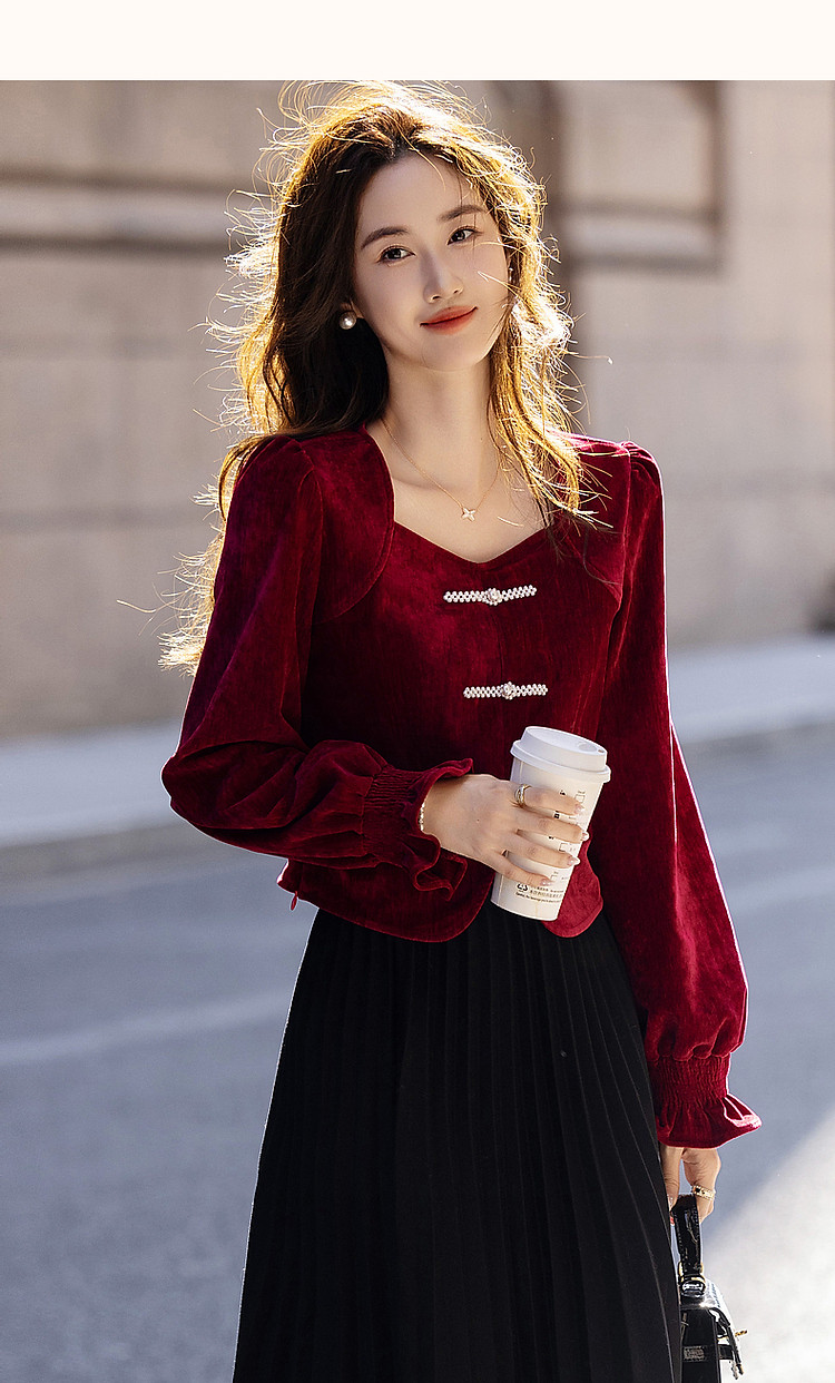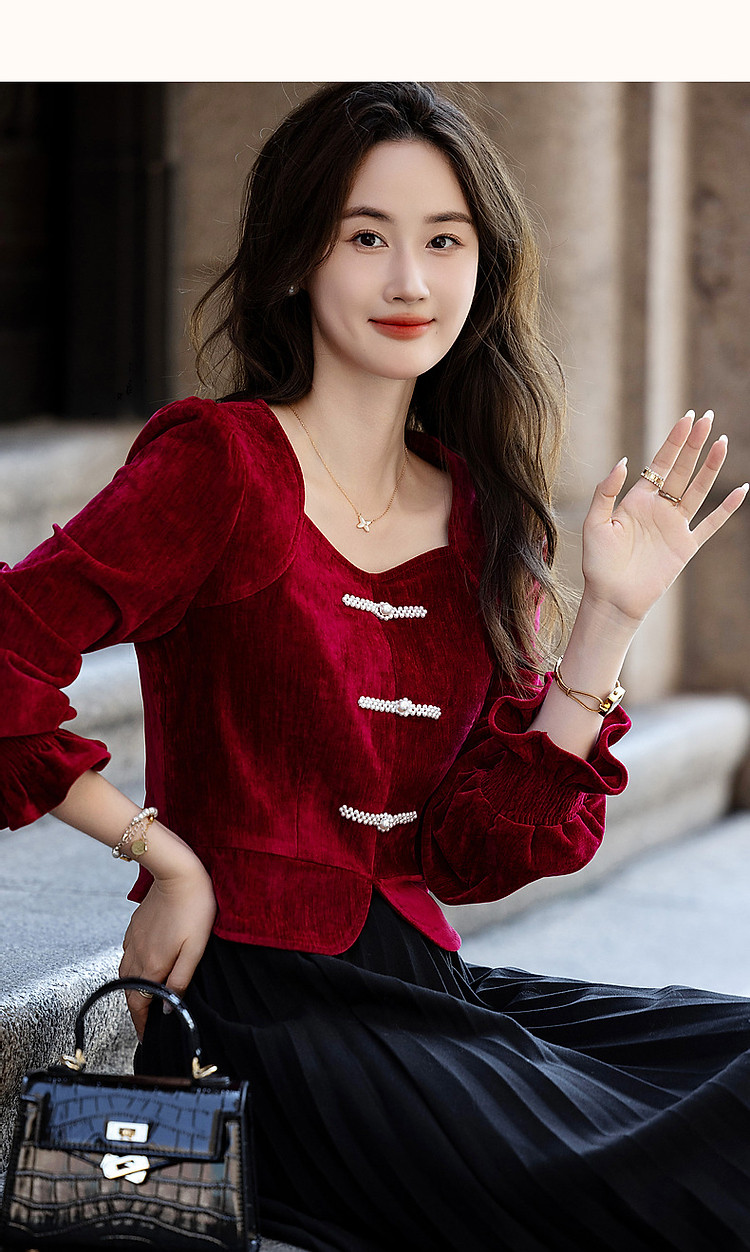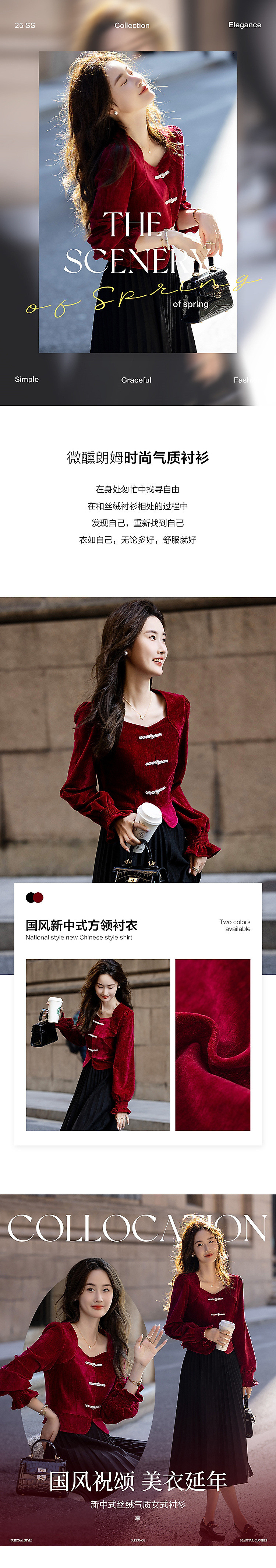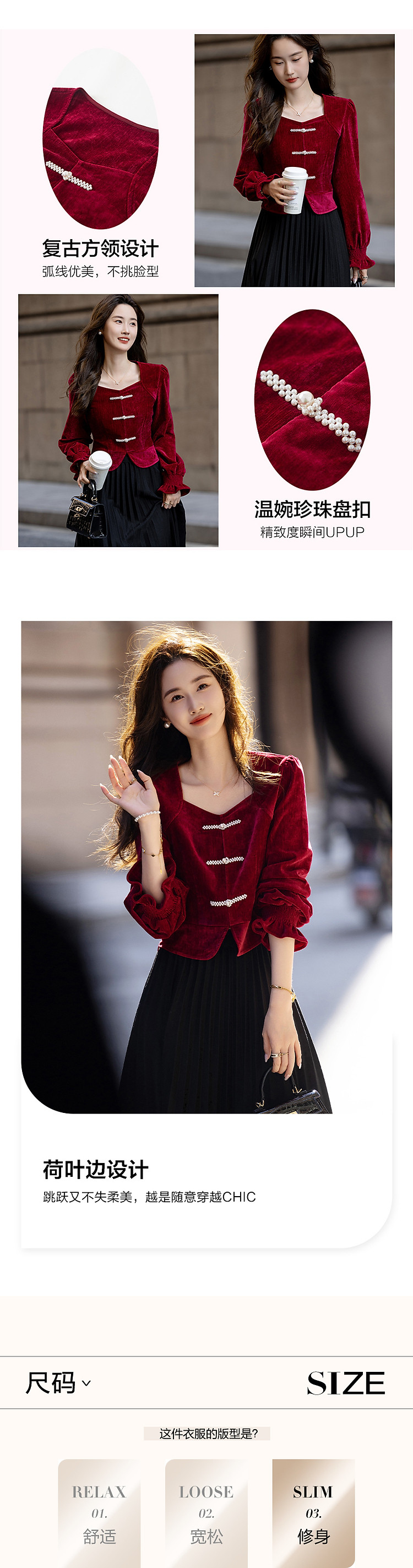 商品名称:【疏星晚月】春秋国风新中式方领衬衫珍珠盘扣丝绒衬衣女装上衣 308673