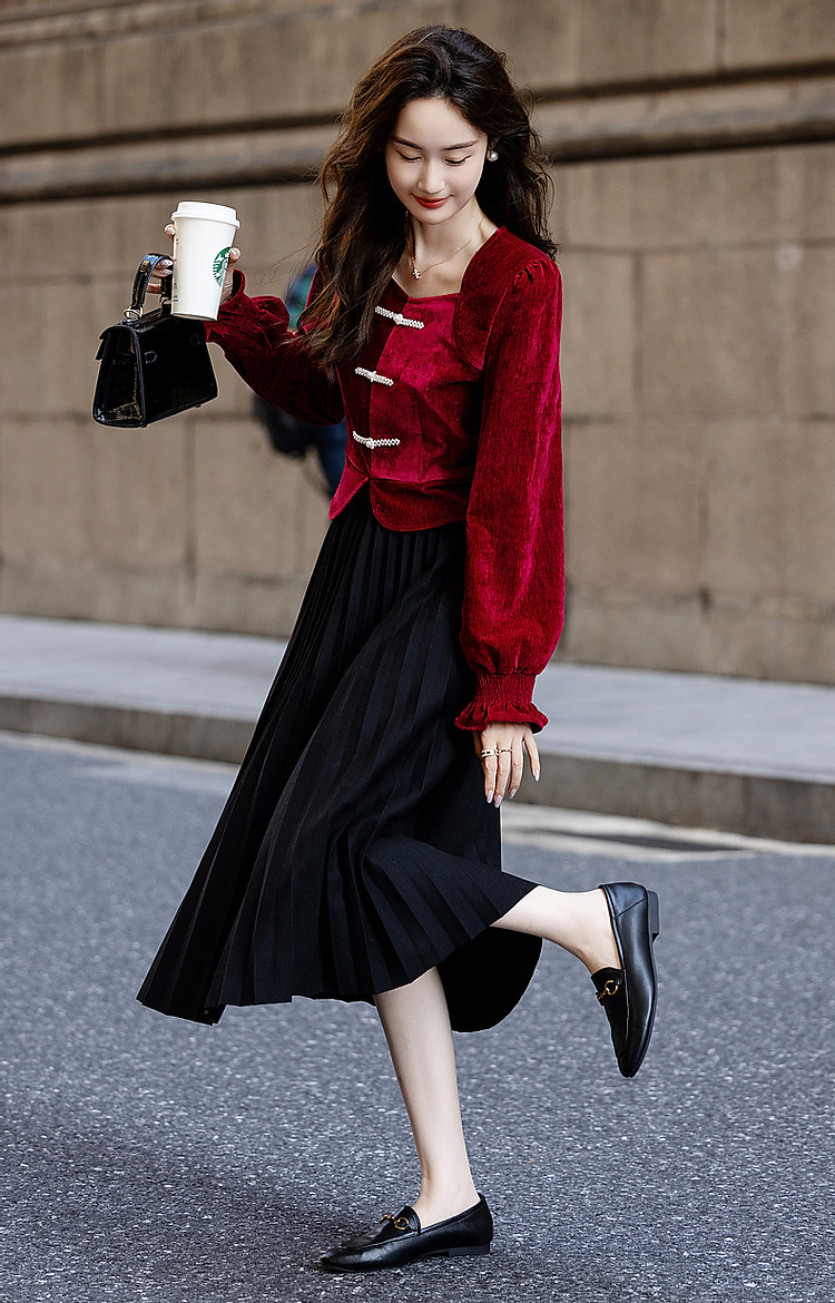 【疏星晚月】春秋国风新中式方领衬衫珍珠盘扣丝绒衬衣女装上衣 308673