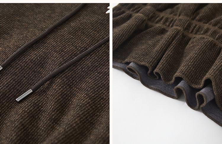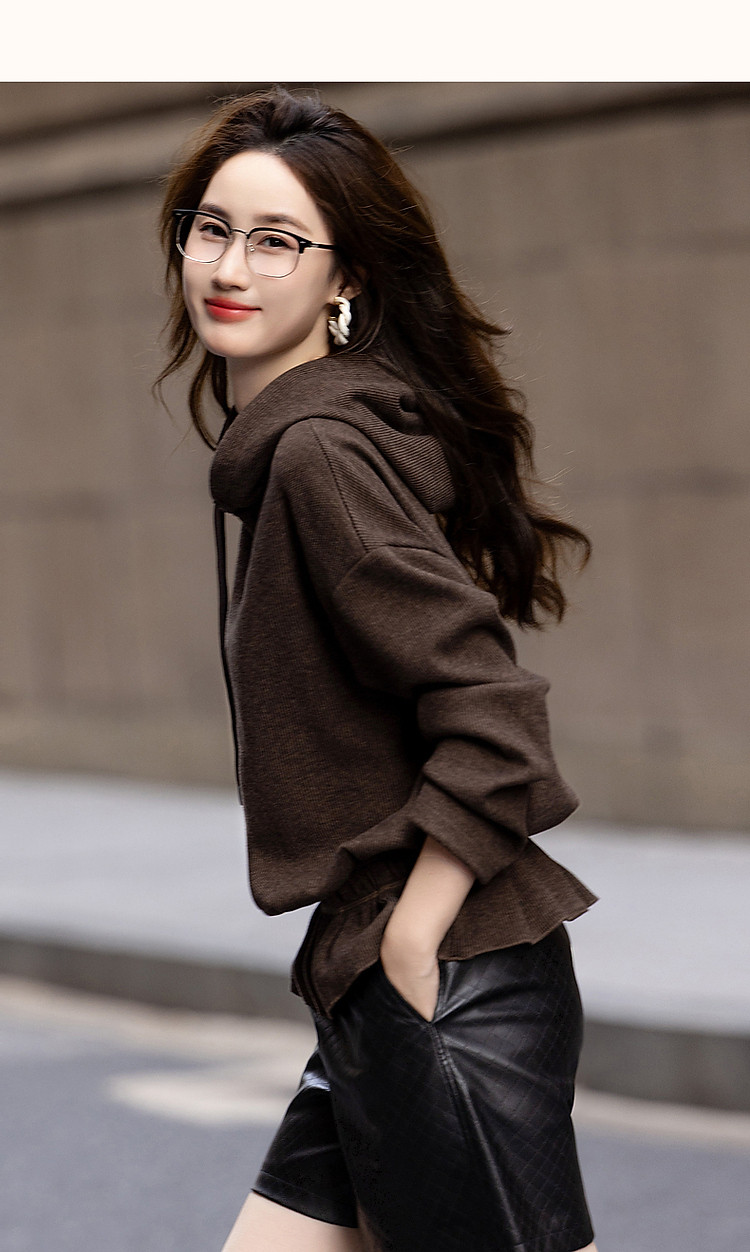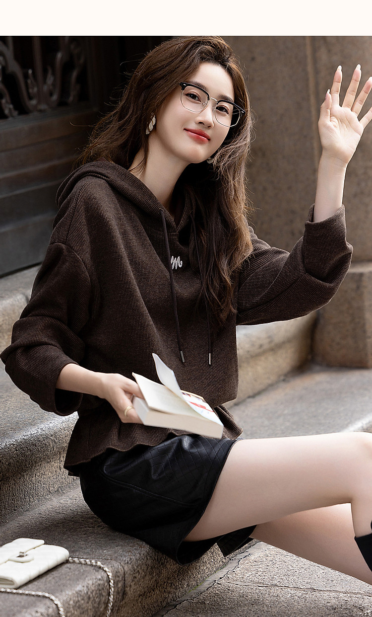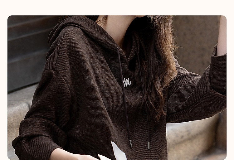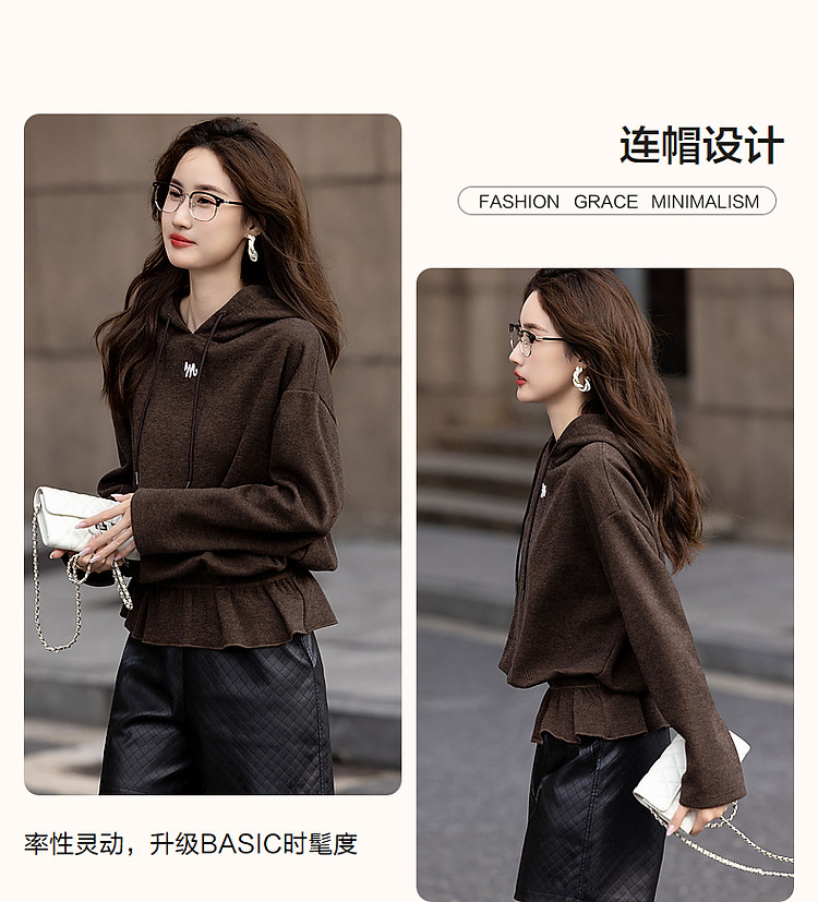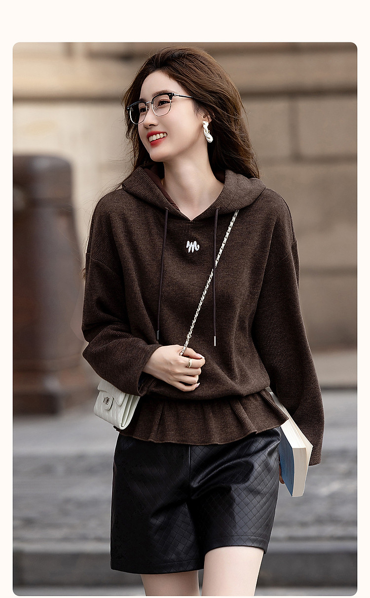 商品名称:【口碑减龄】春秋休闲连帽宽松藏肉字母绣花荷叶边下摆针织上衣 775937